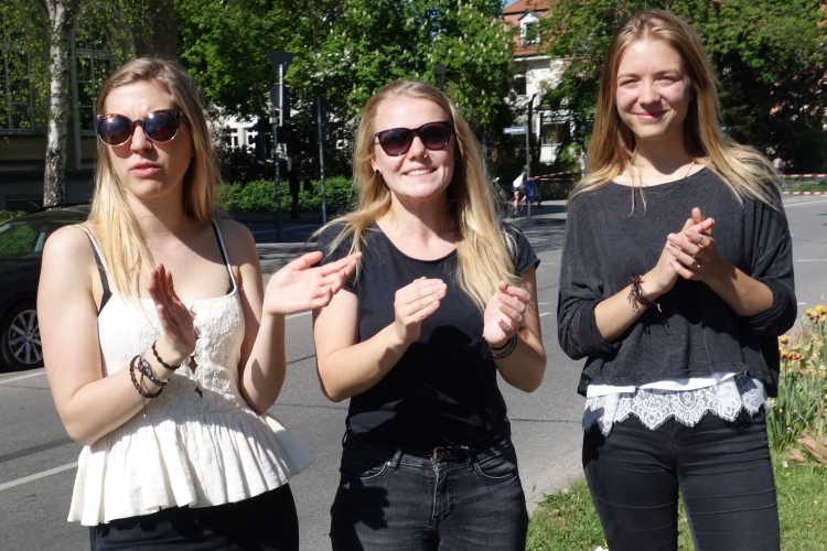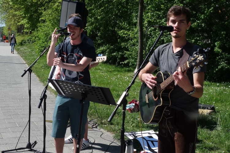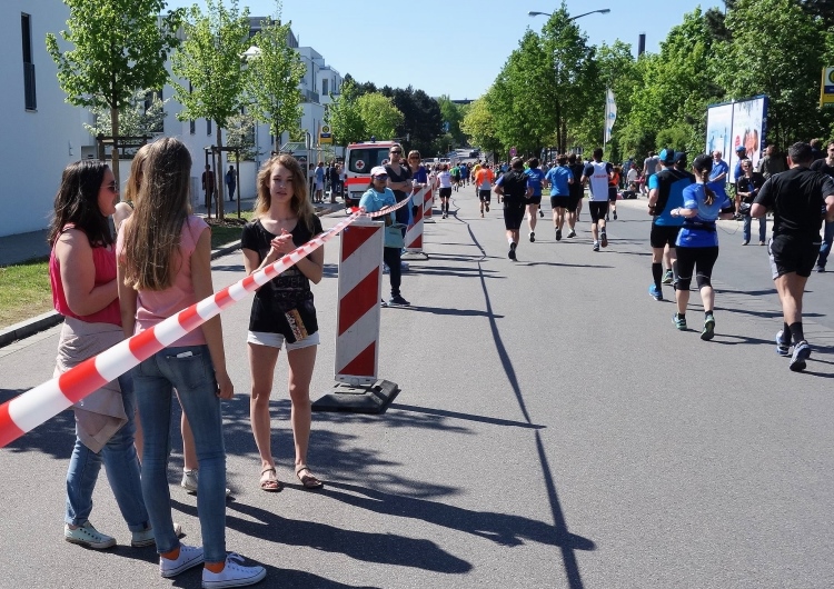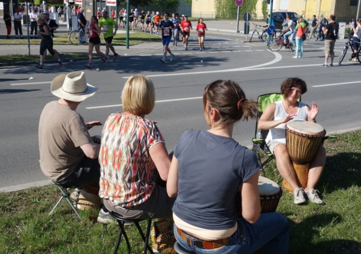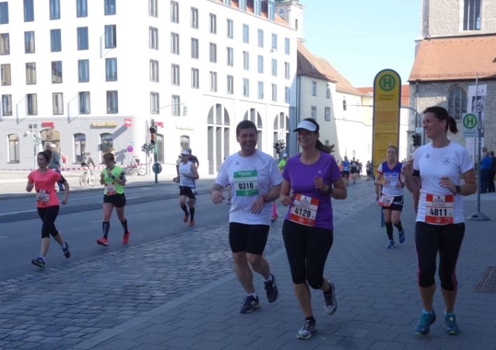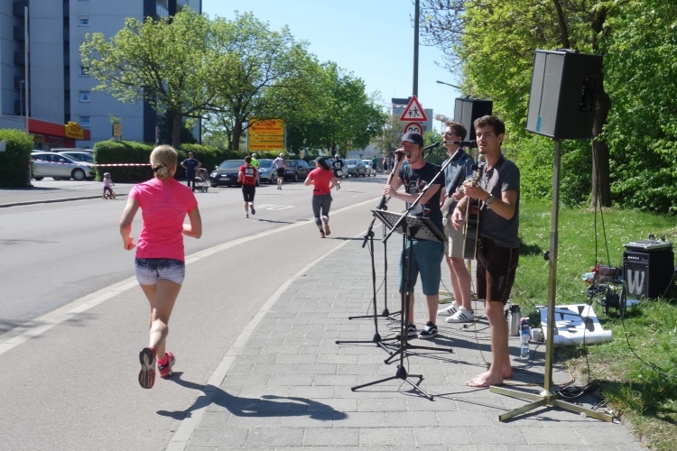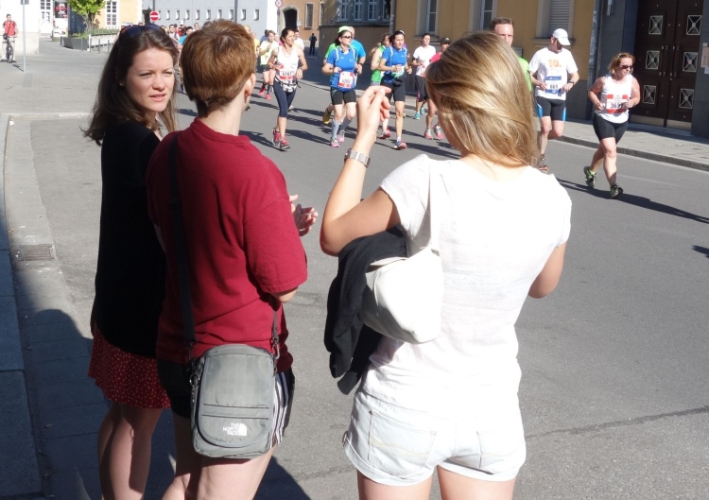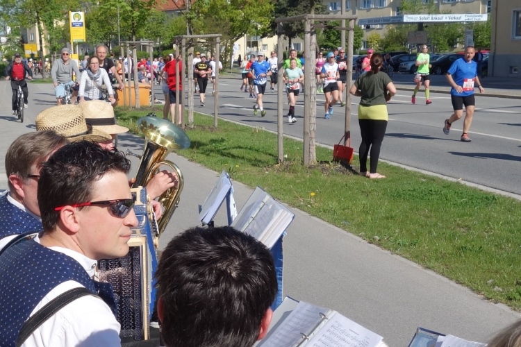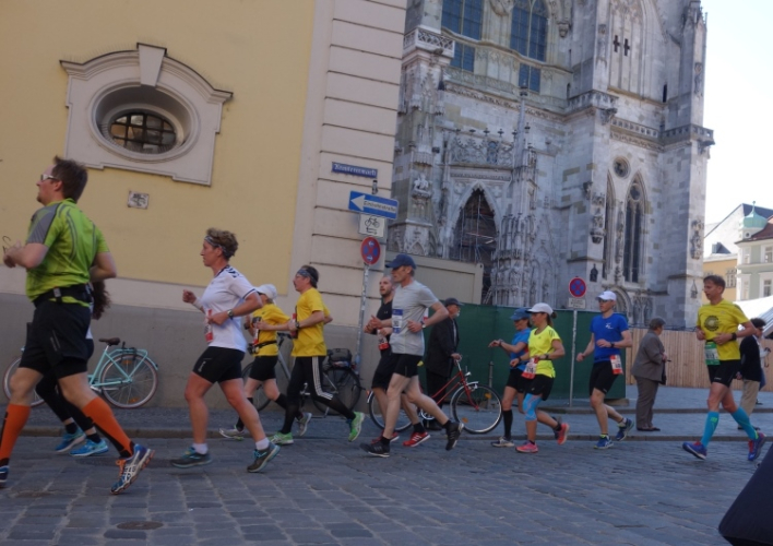Über den Krauterermarkt geht es ruckzuck zur Donau. Kurz an den beiden Museumsschiffen vorbei. Wieder Kirchen, schöne Wohnhäuser und dann weiter Richtung Osten. Am Minoritenweg eine Verpflegungsstelle mit bester Musik vom Sonnendeck-Quintett. Die Bruderwörthstraße bringt mich zum Schwärmen. Vor der AOK steht eine Boygroup gesetzteren Alters, "Die Ruam" genannt, und macht Musik mit bayerischen Texten, die irgendwie vom Marathon handeln. Dann diese Mädels am Streckenrand, die hier viel Spaß beim Kuchenfrühstück haben. Gegenüber viele Kinder, die ungestört auf ihren Trommeln herumhauen dürfen.