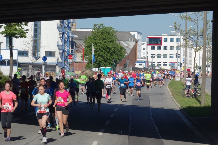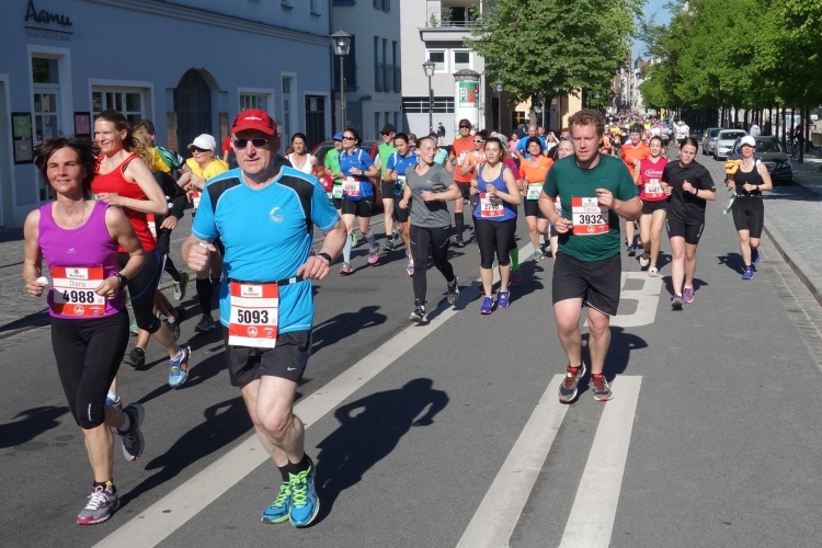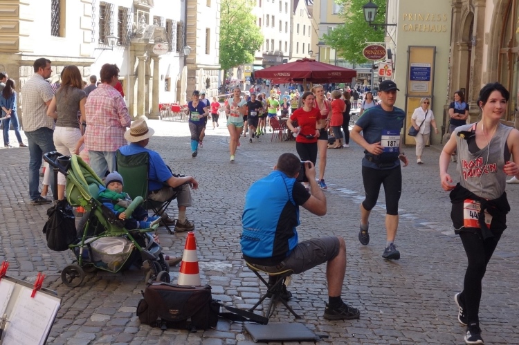 Am Ostentor gesellen sich jetzt die Viertelmarathonis zu uns. Oder besser gesellten. Um 11:30 Uhr gestartet, ist hier 50 Minuten später bei Kilometer fünf keiner mehr unterwegs. Aber einige wenige werde ich bis ins Ziel noch einsammeln. Judith berichtet, dass sie 20 Minuten früher von den schnellere10-km-Läufern mitgezogen wurde. Super die Innenstadtdurchquerung. Jetzt fallen die unterschiedlichen Straßenbeläge auf. Richtig schlimmes Kopfsteinpflaster gibt es fast nirgends.