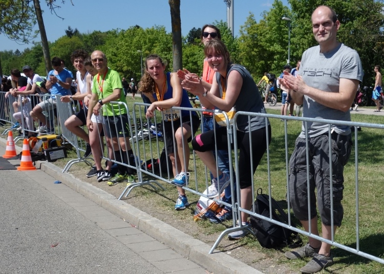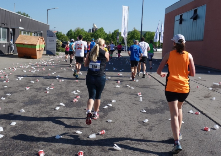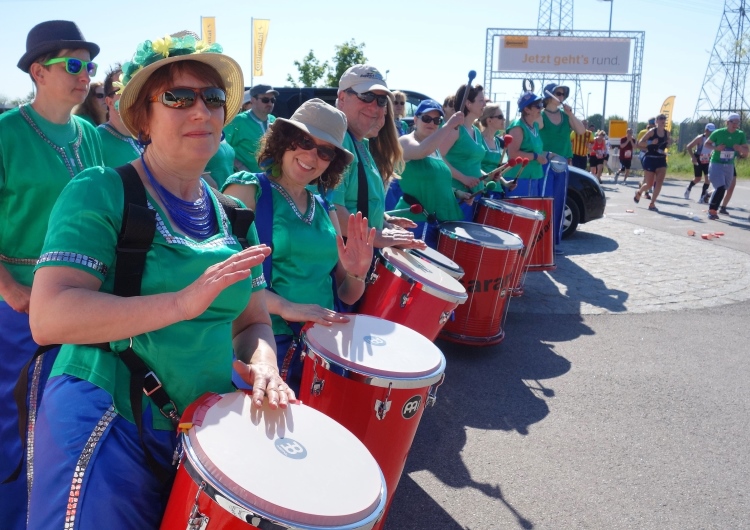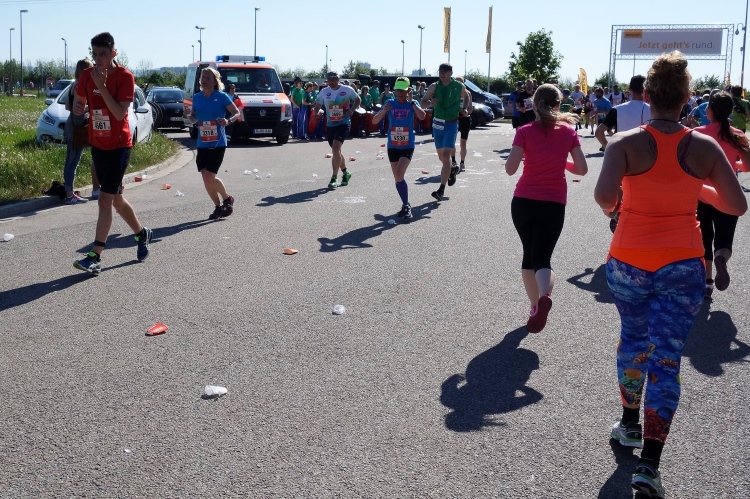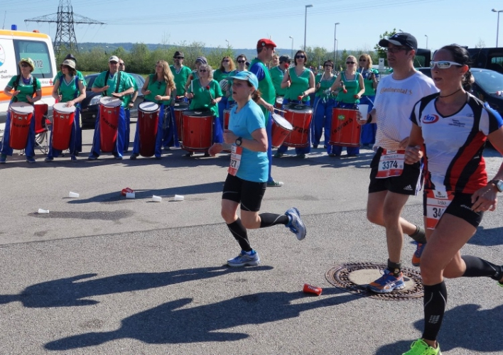 Als Kilometerschilder dienen hier modifizierte Sicherheitsbaken. Auch ganz nett. Am Beginn der Continental-Schleife sehe ich Judith. 12 Minuten liegt sie vor mir. Die große Trommelgruppe Sarara steht jetzt direkt bei der Verpflegungsstelle. Aber bis dahin sind es ja noch 1,3 Kilometer. Dann endlich Getränke. Was gäbe ich jetzt für Eisgekühltes. Aber warmes Iso und Bananen sind ja auch nicht zu verachten. Mir kann man es einfach nicht recht machen: Vor zwei Wochen in Zürich war mir alles zu kalt.