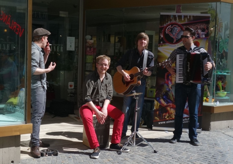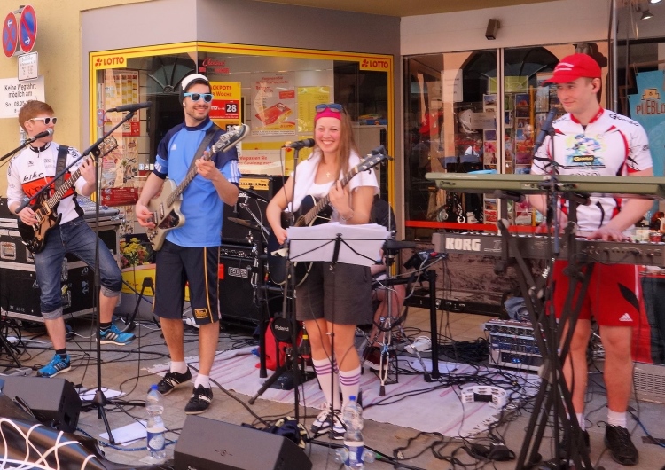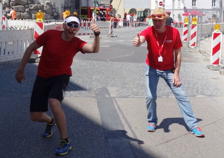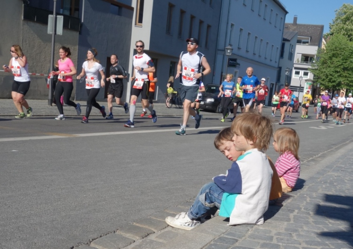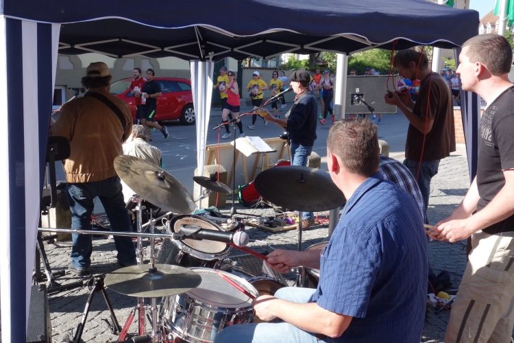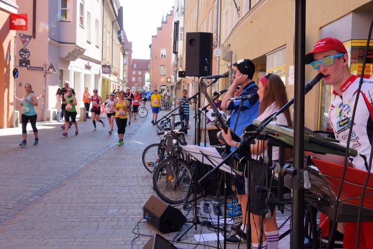 Viele Zuschauer harren an der Strecke aus und alle Bands sind noch bei der Sache. Die Cafés haben sich inzwischen gefüllt. Der Gutenbergplatz soll ein kaffeetechnischer Hotspot sein. Frühstück ist angesagt. Der Kleidung der Zuschauer nach muss das heute ein sehr heißer Tag sein – nicht nur für uns, die wir ohnehin vor Anstrengung schwitzen. Eine kleine Überraschung: Am Kolpinghotel verläuft die Strecke jetzt durch einen Durchlass in der alten Stadtmauer.