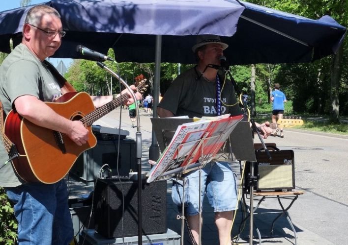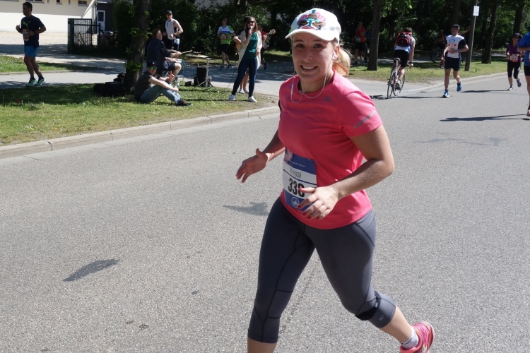 Zwei Musikgruppen weiter kommen wir zum Zielgelände. Krissi entschuldigt sich bei mir, weil sie ins Bild läuft. Keine Ursache, ich habe ein super Foto mit Marathoni und Sängerin im Kasten. Viele biegen nach rechts auf die letzten 100 Meter. Ich halte mich links für die nächste Runde und freue mich auf den zweiten Durchgang, bei dem man die schöne Stadtdurchquerung noch mal richtig genießen kann. Außerdem startet nun mein Projekt Aufholen.