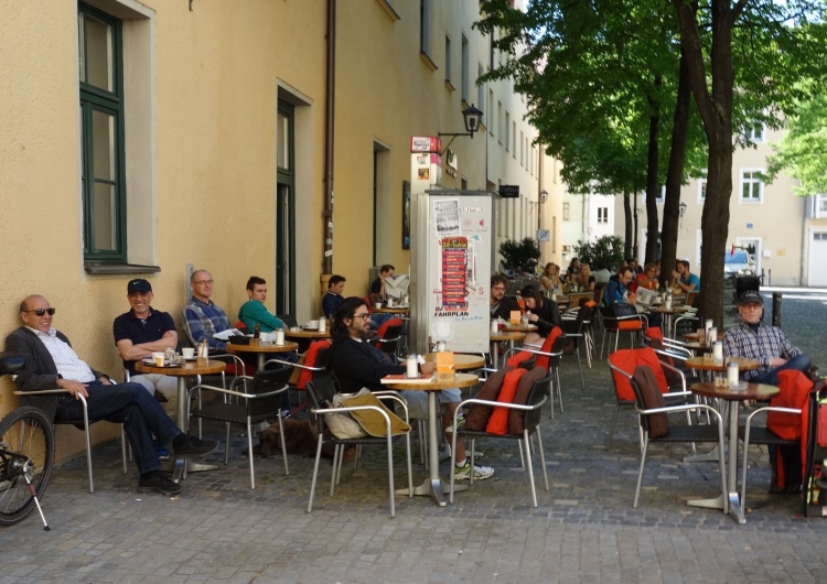 Wir kommen bei der Baustelle für das geplante „Haus der Bayerischen Geschichte" wieder an die Donau. Menschenmassen erwarten uns. Unter den Bäumen kann man die eingerüstete Steinerne Brücke sehen, Zeichen des Wohlstands der mittelalterlichen Stadt und hoffentlich nach dem Ende der Renovierung wieder Teil der Marathon-Laufstrecke. Davor die Wurstküche, der Überlieferung nach die älteste Wurstbraterei der Welt. Seit 850 Jahren versorgt sie Einheimische und Fremde mit herzhaften Spezialitäten (Läufer heute jedoch nicht).