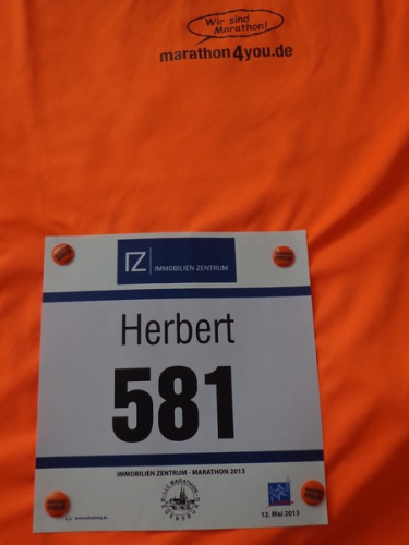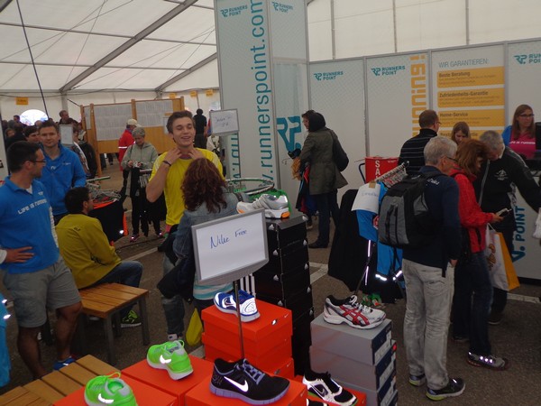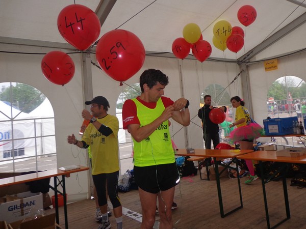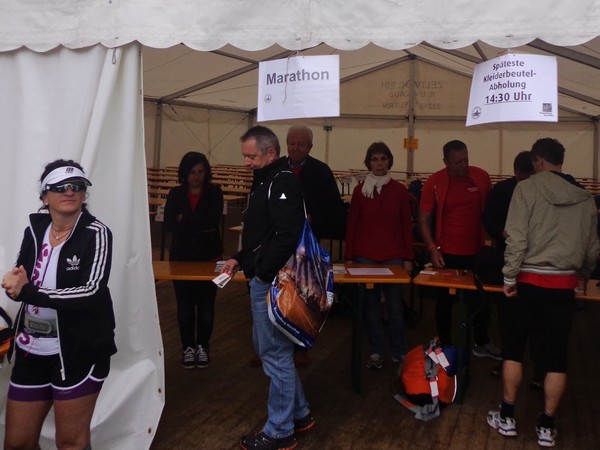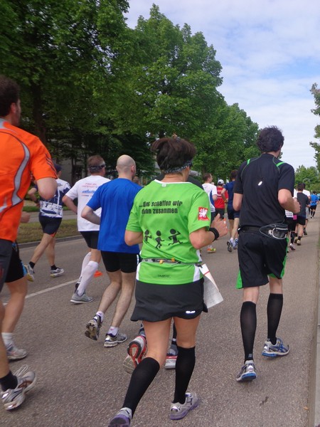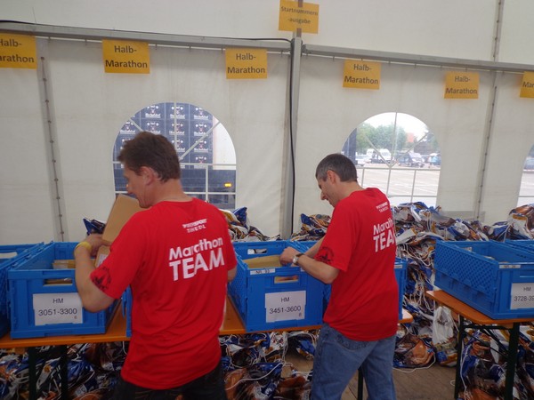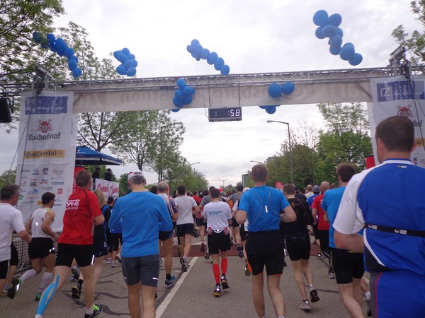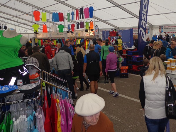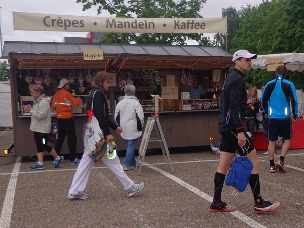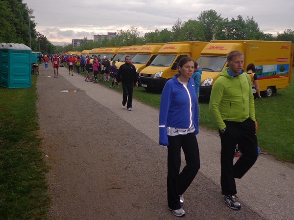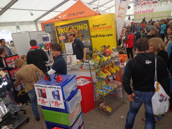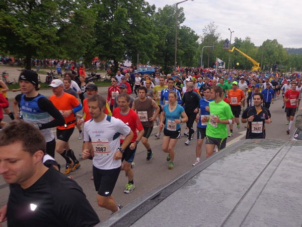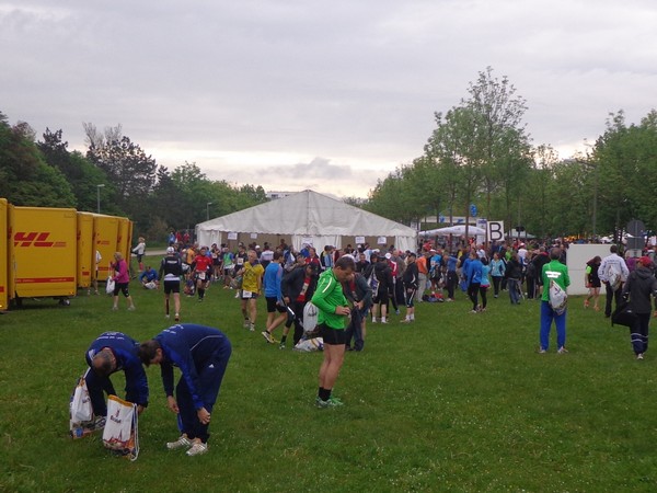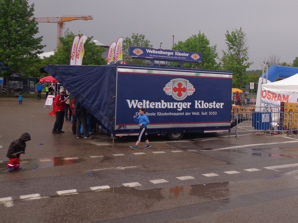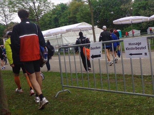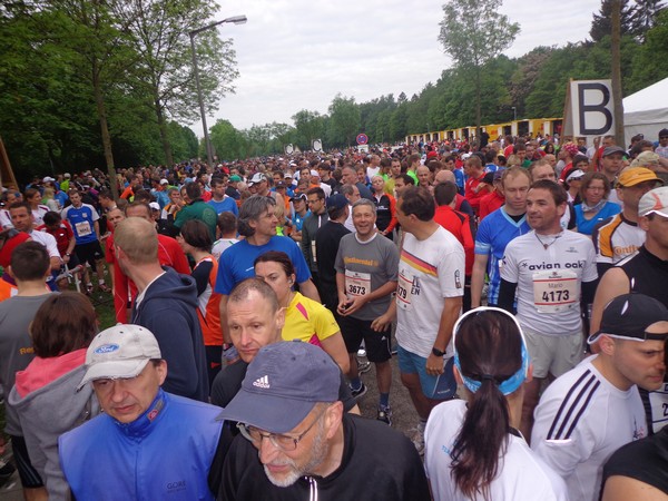 Strahlender Sonnenschein am frühen Morgen des 12. Mai. Geralds Wohnung liegt äußerst günstig zu Start und Ziel, ein kurzer Spaziergang und ich bin da. Eine Live-Band baut gerade ihre Bühne auf, die Sonne hat sich versteckt. Die Sport-Messe im Zelt hat schon geöffnet. Draußen hat es keine 10 Grad, so halten sich viele im Zelt auf. 669 Marathonläufer waren am Samstag angemeldet, 2426 über die halbe Distanz.
