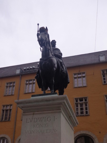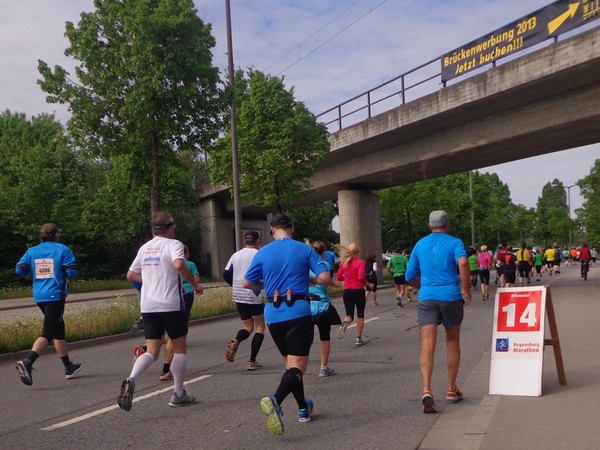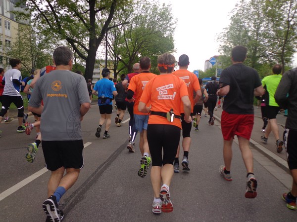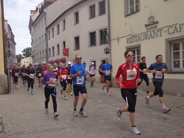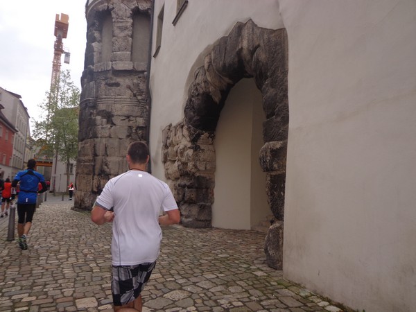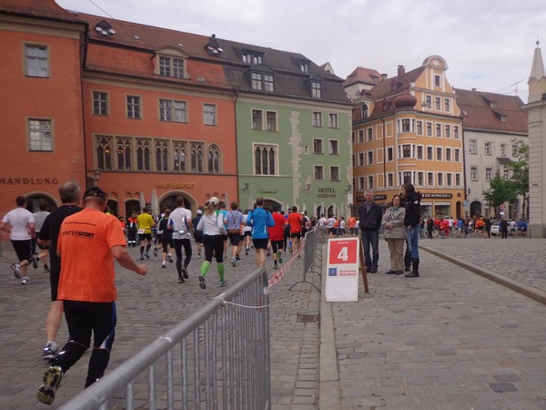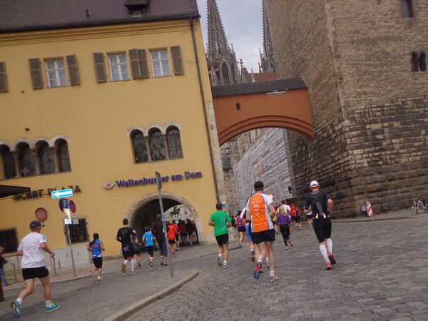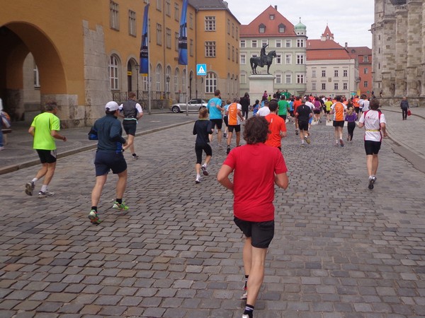 Hier ist es relativ eng, gut für die Stimmung. Es weitet sich zum Neupfarrplatz, hier sind viele Zuseher, dabei ist es Sonntagfrüh. Wenn ich nicht fotografiere, laufe ich gut mit in der Masse. Bevor wir zum Dom kommen, müssen wir für ein paar 100m auf altem Straßenpflaster laufen, unter den Augen eines Reiterdenkmals vom bayrischen König Ludwig I. Gestern hatte sein Pferd noch einen Strohhut auf, der ist heute weg. Blick über die rechte Schulter auf die prächtige gotische Fassade des Regensburger Doms. Nach fast 600 Jahren fertiggestellt und seitdem eine Dauerbaustelle, wie alle diese großen Kathedralen.
