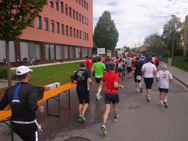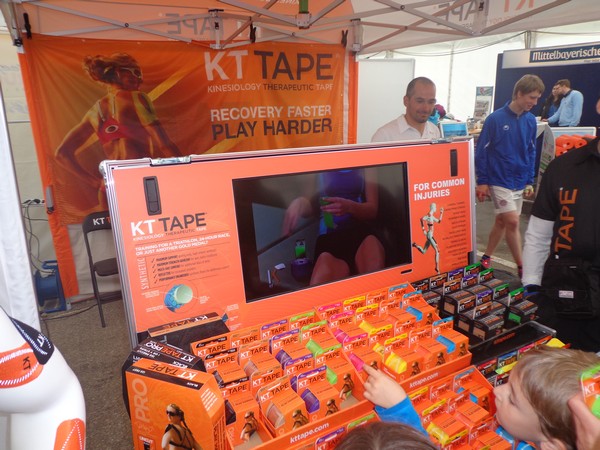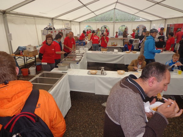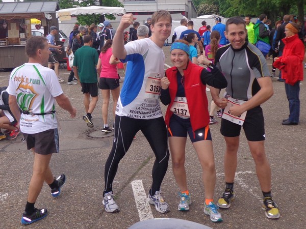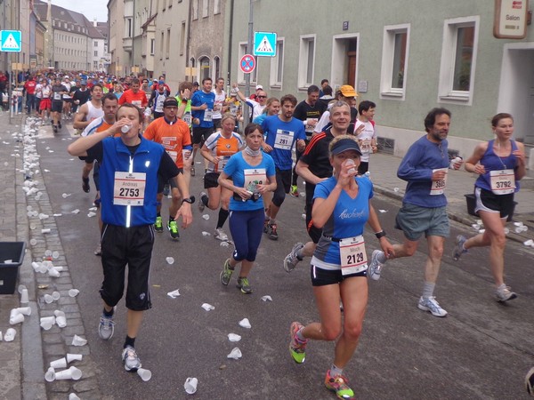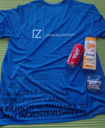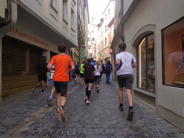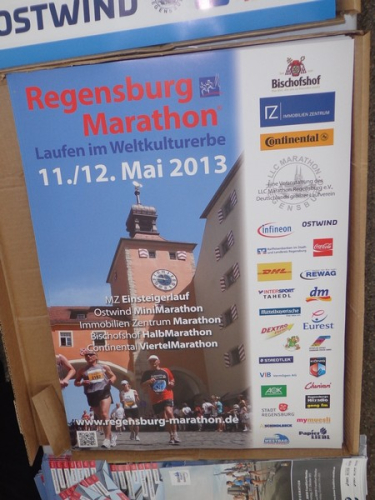 Samstag am Nachmittag hole ich mir den Starterbag ab. Die Kinderläufe haben bereits stattgefunden, man wartet auf die Siegerehrungen. Das Zelt mit der kleinen Sport-Messe ist gut besucht. Draußen ist kaum jemand, die Tische und Bänke sind verwaist, wegen des Regens. Ah, Regensburg, daher also der Name! Die schmackhafte Pasta Asciutta müssen wir daher im Stehen essen. Dafür ist die im Startgeld inklusive, hat man auch nicht mehr oft.