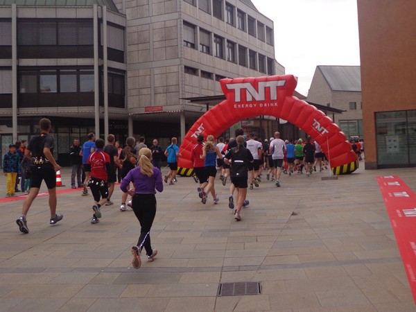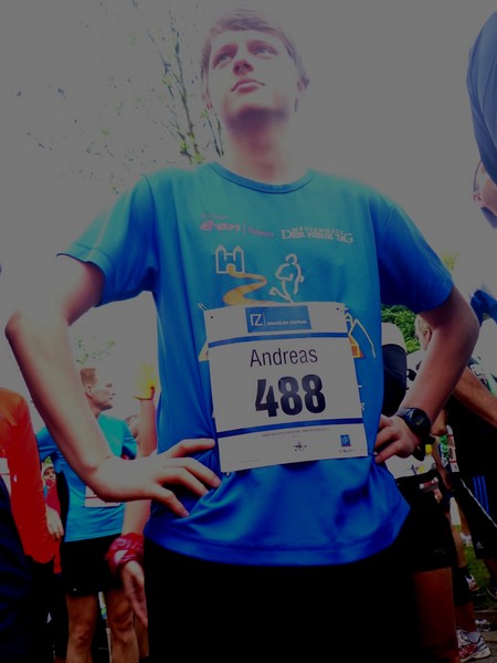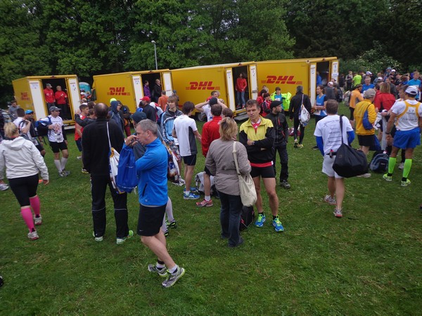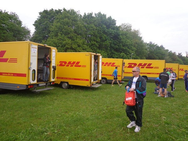 Kleiderbeutelabgabe im Zelt, die Halbmarathonis haben eine Armada von DHL-Zustellwägen für Ihre Habseligkeiten zur Verfügung. Wenn man sich so umhört, sind zu einem sehr großen Anteil StarterInnen aus der Region hier. Die haben was nachzuholen, immerhin hat diese Veranstaltung zuletzt 2011 stattgefunden. In der Startaufstellung fällt mir der junge Andreas auf, er trägt ein Shirt vom 4. Freundschaftsmarathon Amberg – Weiden. So eines habe ich auch zuhause. Das wird heute sein zweiter Marathon werden, er will sich am 3h44-Ballon orientieren (und wird ihn klar distanzieren!).