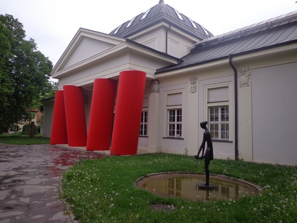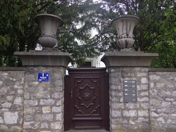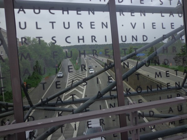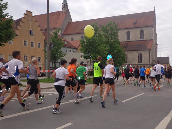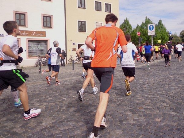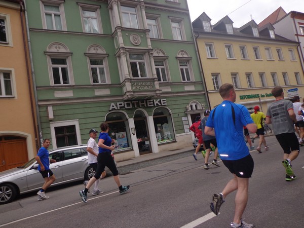 Gestartet wird um 08h30 und bald geht es ein paar Höhenmeter rauf. Die Strecke ist breit genug. Nach einem Kilometer steht uns eine lange Gerade Richtung Altstadt bevor. Anwohner stehen auf der Straße und applaudieren. Erst geht es noch über die eingehauste A93, dann an einigen Villen vorbei. Da sind ganz schicke Häuser darunter, eine gute Wohngegend. Von links werden wir mit Live-Musik verwöhnt, rechts ein Museum mit knallroten Säulen. Ein Super Fotomotiv. Hinter den Mauern der Stadtpark, wir laufen in die Innenstadt, ein Stück am Jakobsweg. Zwischen Jakobsapotheke und Jakobskirche durch zum Theater, bald sind wir bei km3.