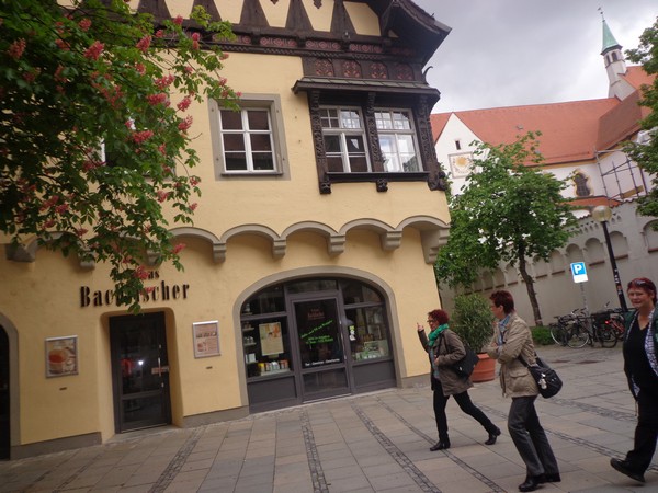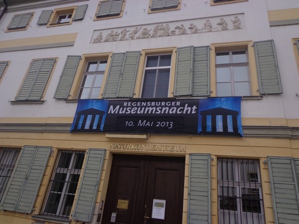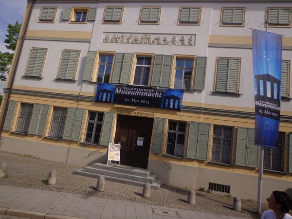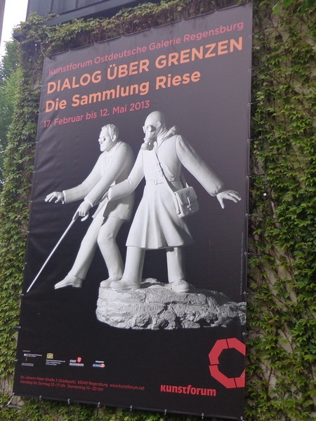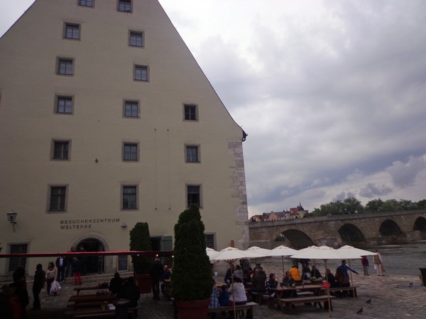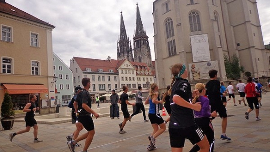 Nun wieder etwas Pflastersteine. An der Steinernen Brücke biegen wir links ab, es geht 100m rauf in die Altstadt. Vor mir David und Goliath imposant auf ein Hotel gemalt, die Goliathfigur erstreckt sich über drei Stockwerke! Beim alten Rathaus wartet eine der beiden 3h59-Zugläuferinnen und schließt sich wieder an. Die beiden verströmen Fröhlichkeit. Vorbei am Running Sushi. Im Kino runter zur Donau spielen sie den „Großen Gatsby“, an der Donau werden wir versorgt.