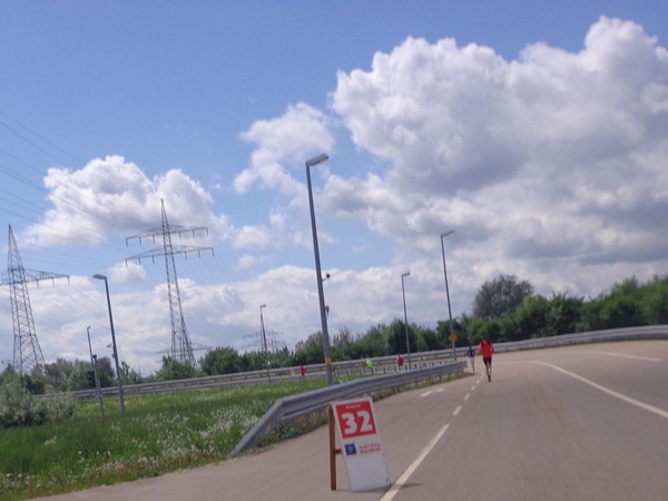 Ich bin bei km27, die erste Frau im Feld begegnet mir. Sie ist bei km36 und wird von einem Radfahrer mit entsprechendem Hinweisschild am Rad begleitet. Wenige Sekunden dahinter die zweite Frau mit Radfahrer. Es wird windig und es sich zieht zu.