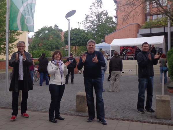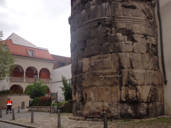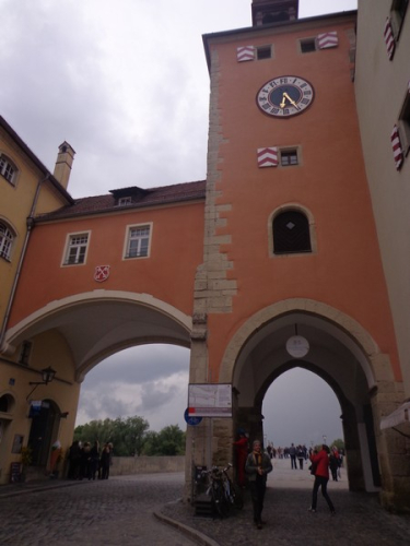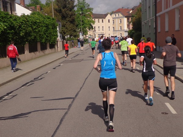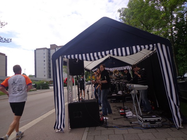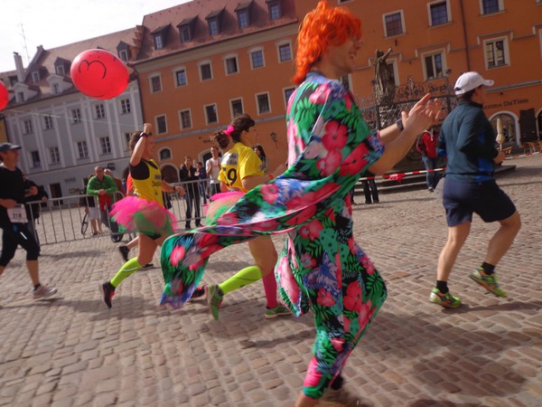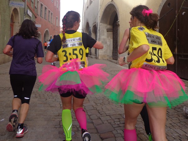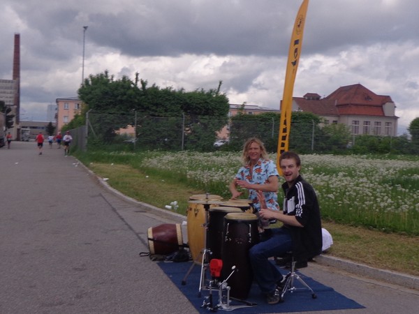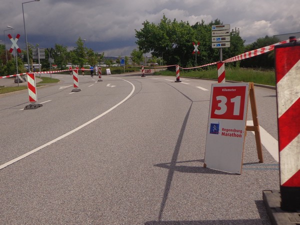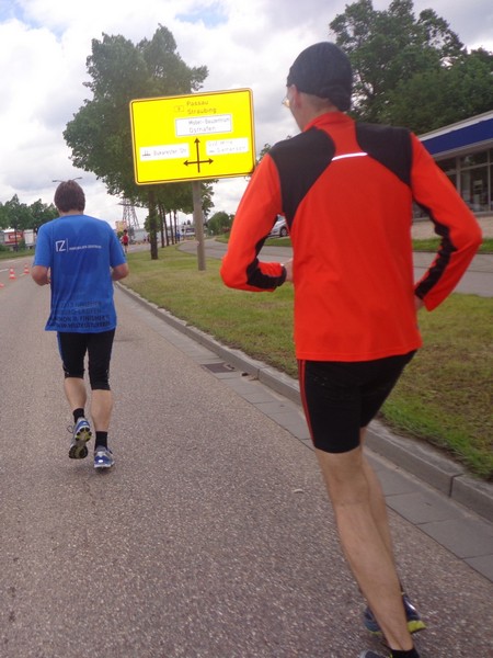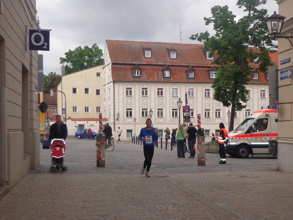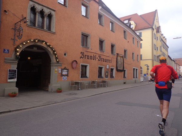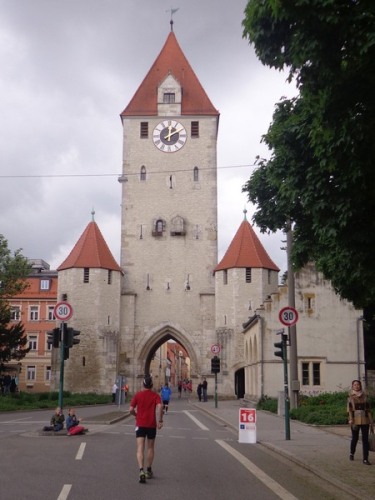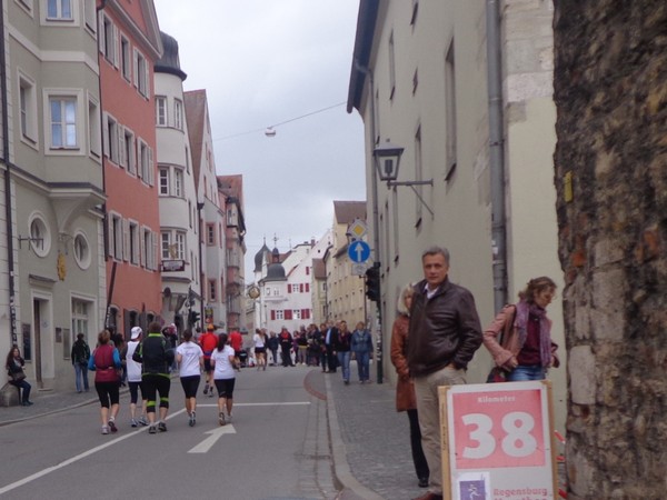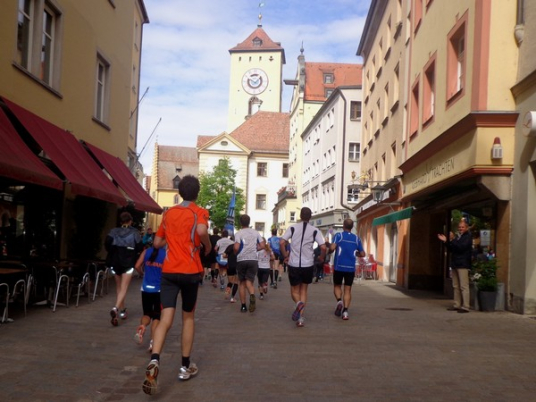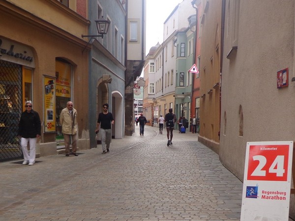 Bei km16 geht es durchs Stadttor, es ist immer noch sonnig. Bevor wir an die Donau laufen gibt es zwei Stimmungsaufheller mit Mikrofon, die die Läufer, vor allem aber die Zuschauer, in Stimmung bringen. Die, gut gelaunt, feuern ihrerseits die LäuferInnen an.