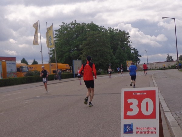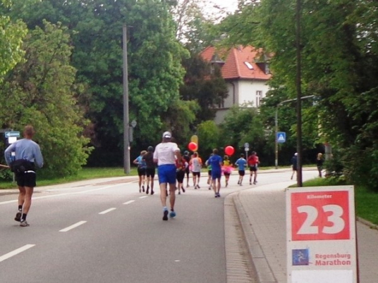 Ein leichtes Gefälle Richtung Ziel, die Halbmarathonis biegen ab, für uns in der Königsdisziplin geht es nun leicht bergauf. Knapp vor den 3h59-Damen löse ich die Zwischenzeit aus, 32 sec zu spät. Ich muss etwas verschnaufen, meine beste Zeit heuer soll es aber schon werden. Die Strecke kenne ich nun und kann sie mir einteilen. Platz ist ja jetzt in Hülle und Fülle. Musik bei km22 und einen km später beim Kunstforum schon wieder. Am Stadtpark vorbei erreiche ich bald wieder die Altstadt, an der Jakobskirche vorbei. Ein Grüppchen 1. FC Kaiserslautern-Anhänger hat ihre Mannschaft zum Auswärtsspiel gegen Jahn Regensburg begleitet.