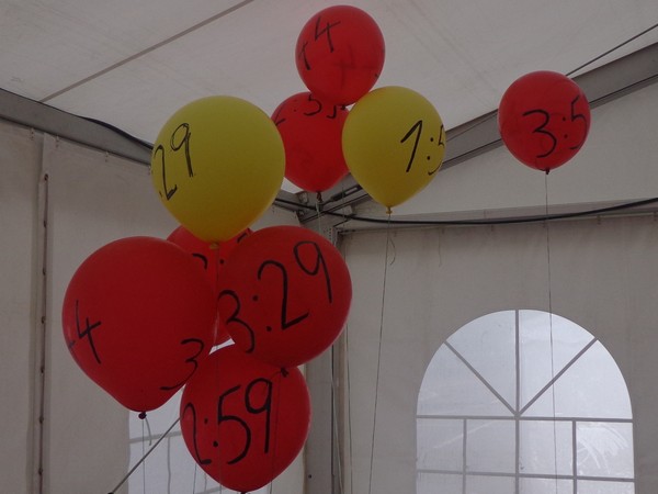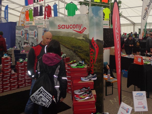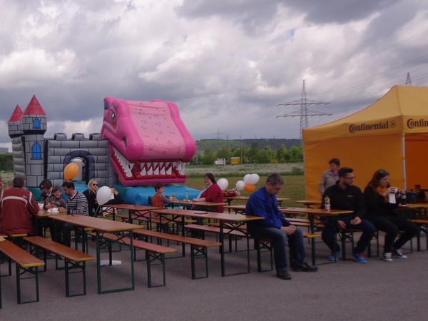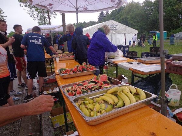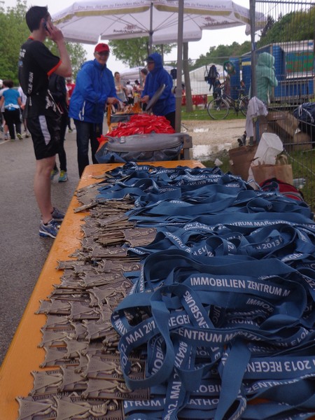 Im Zelt mit dem Kleiderdepot ziehe ich trockene Sachen an. Es regnet unvermindert weiter, die Wiese vorm Zelt ist schon matschig. Eine Läuferin, in etwa mein Alter, frage ich, ob sie heute denn nicht Muttertag feiern müsste? Nein, nein, laufen ist viel schöner, sonst müsste sie jetzt bei Kaffee und Kuchen rumsitzen. Da ist es da doch viel besser. Trotz Regen! Viele Tische und Bänke für ein gemütliches Beisammensein nach dem Rennen stehen im Freien und bleiben folglich ungenutzt.