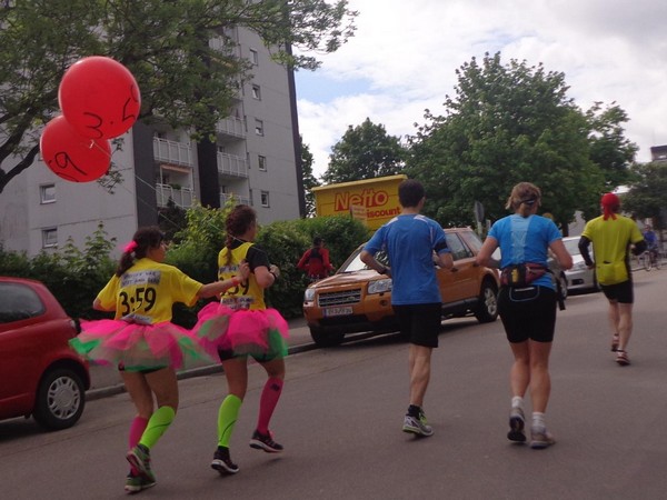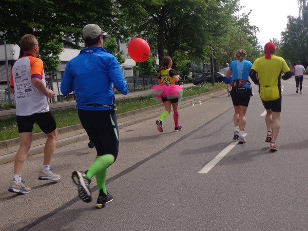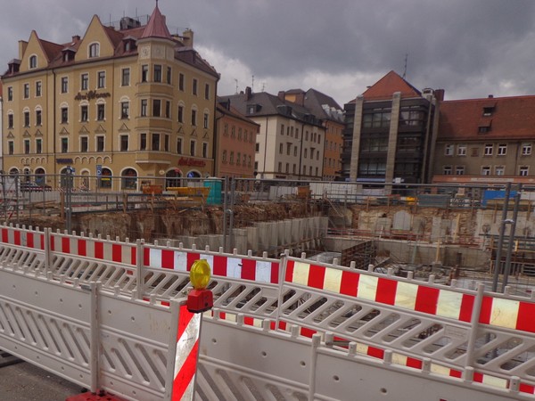 Unterm Kolpinghaus durch, da sind wieder die aufmunternden Platzsprecher mit Lederhut. An einer großen Baugrube vorbei kommt am nächsten U-Turn der 3h59er Ballon wieder in mein Blickfeld.