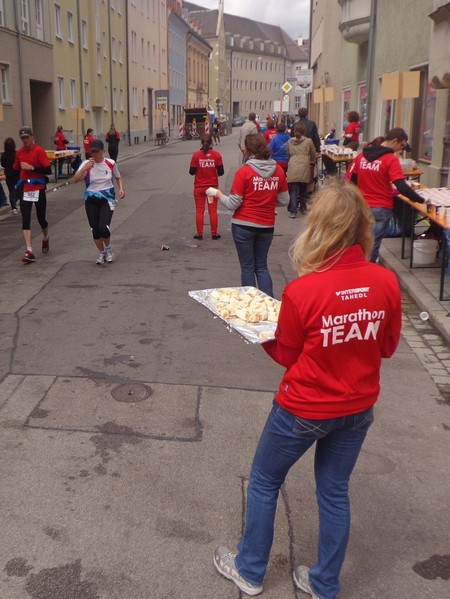 Die 3h59-Gruppe habe ich nach der Gesandtenstraße, km24, aus den Augen verloren. Am Neupfarrplatz geht es wieder durch den TNT-Bogen durch. Dieses TNT ist nicht explosiv, es ist ein in Deutschland neuer Energy-Drink, habe ich im Begleitheft zum Marathon gelesen. Kannte ich bis gestern auch nicht.