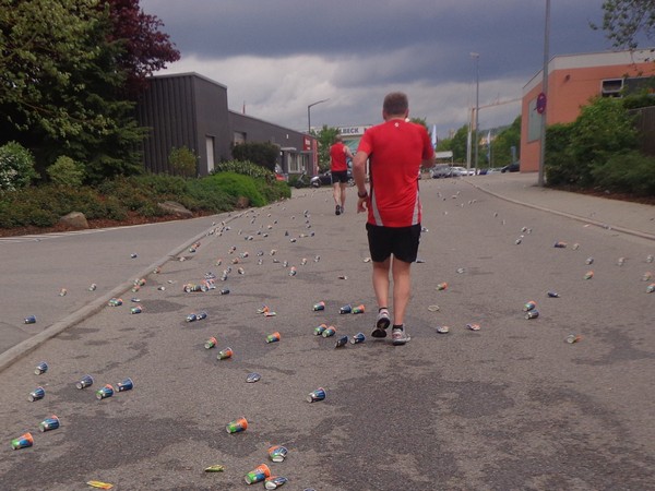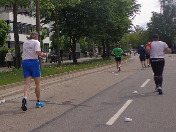 Bei km29 Sonne und es gibt Wasserbecher, der Wind bläst sie in Formation. Ich laufe unter der Osttangente durch, auch hier Live-Musik. Die Burschen haben sich ihre Stimmungsmacherinnen gleich selber mitgebracht, wie es aussieht. Ansonsten ziemlich menschenleer, das Feld ist weit auseinandergezogen. Jaroslav kommt mir entgegen und zeigt mir den erhobenen Daumen, als ich ein Foto mache.