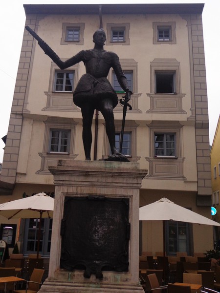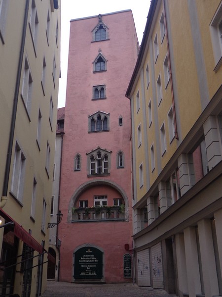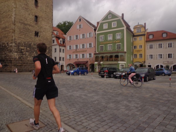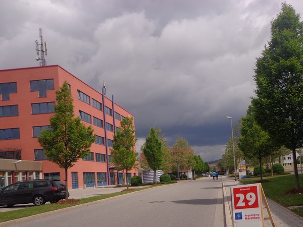 Am mächtigen Salzstadel an der Steinernen Brücke beginnt es zu regnen, und zwar gleich ziemlich heftig. Das Gässchen zum Goliathhotel rauf werde ich wie wild angefeuert, super. Oben dann wird es etwas breiter, die Zuschauer sind geflüchtet oder haben sich untergestellt, auf der Strecke ist man Wind und Regen voll ausgesetzt. Wolkenbruch, trifft es wohl am besten. Noch 4km bis ins Ziel. Was tun? Unterstellen oder in den Laderaum eines Lieferwagens hüpfen wie vorigen Oktober auf Mallorca? Es sieht so aus, als würde es dauerhaft regnen und ein offener Lieferwagen steht in der Fuzo auch nicht rum. Also weiter.