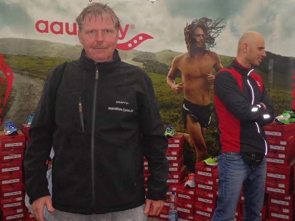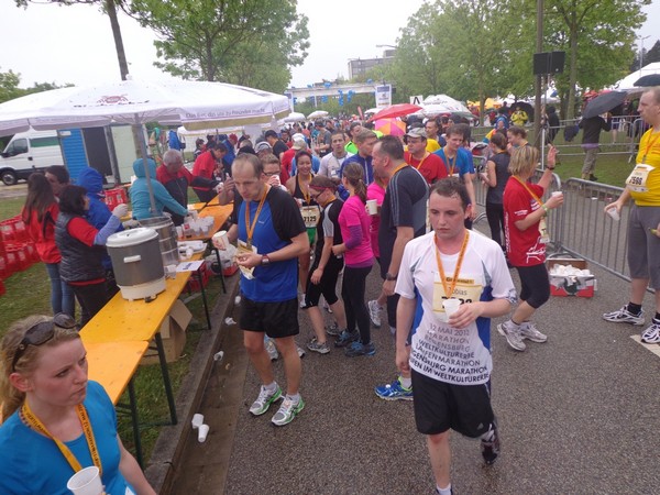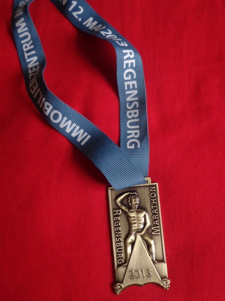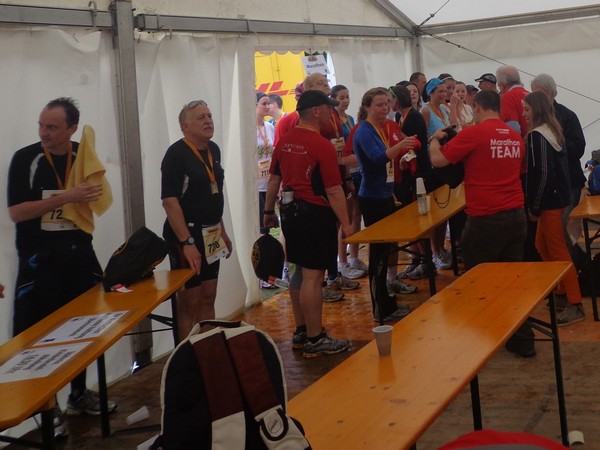 Vorher will man mir noch eine Finisher-Medaille mit gelbem Band geben, denn jetzt kommen fast nur Viertelmarathonis rein. Zu unterscheiden sind die Medaillen an den unterschiedlich farbigen Bändern, heute habe ich mir aber eine Medaille mit dem blauen Band verdient.