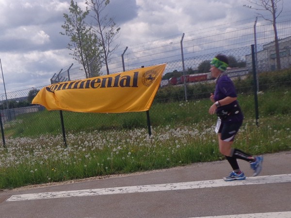 Km10 und Spitzkehre, 57min sind vergangen. Ich laufe hinter dem 1h59-Halbmarathonballon und vor der 3h59 Marathonzugläuferin. Einen Kilometer später bin ich im 3-spurigen Oval mit leicht überhöhten Kurven und einer von hunderten Farbpunkten. Als es wieder rausgeht, gibt es eine Labestelle. Wir werden per Banner informiert: „Und wieder 1,3km geschafft.“