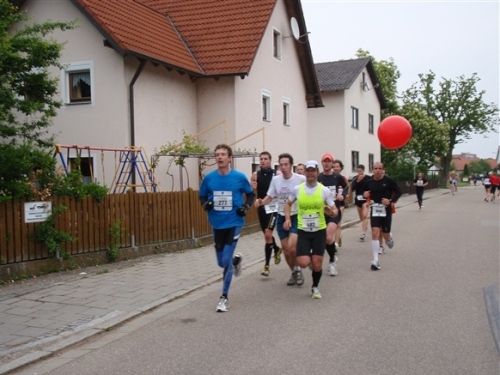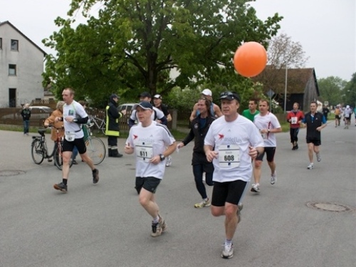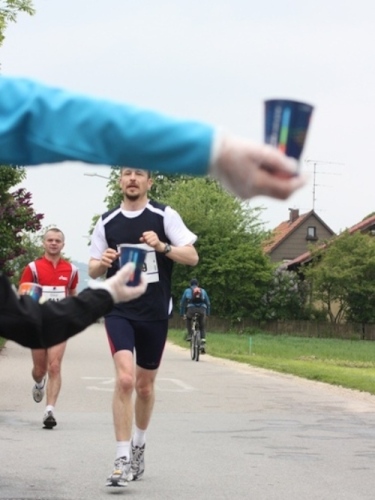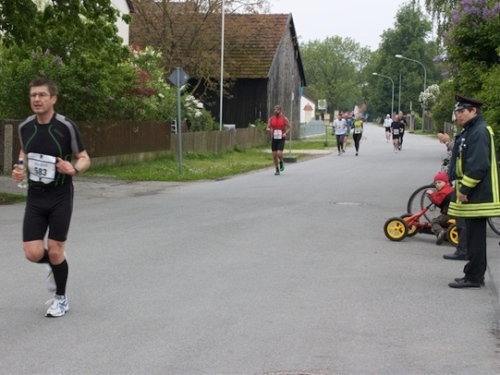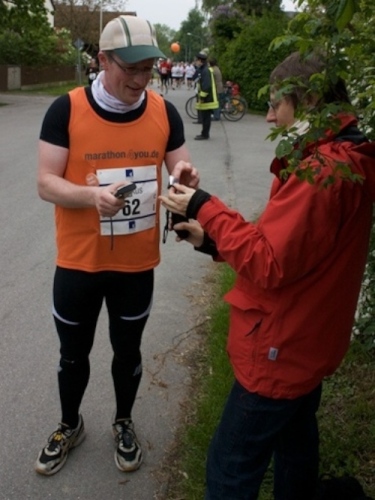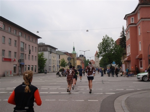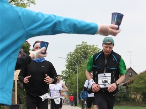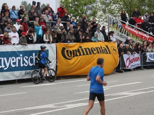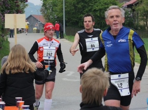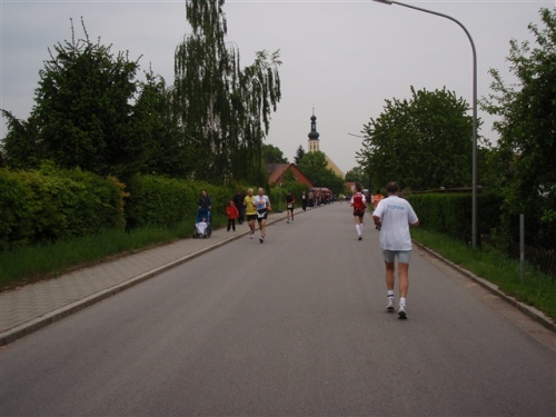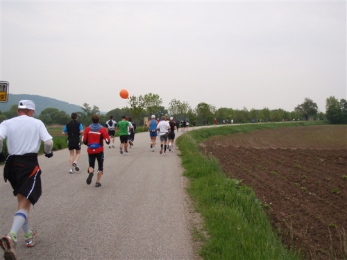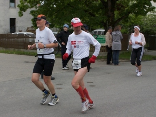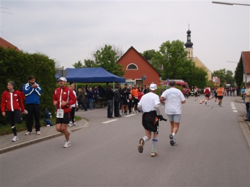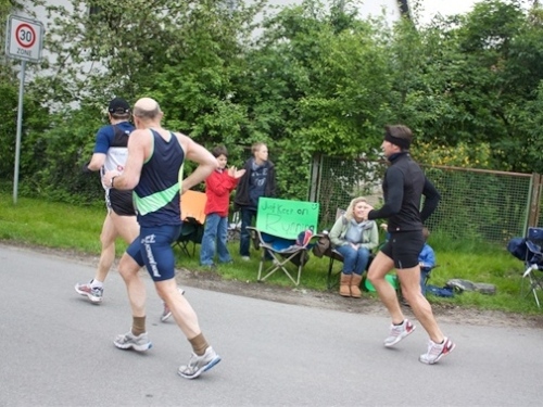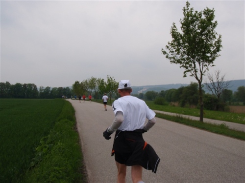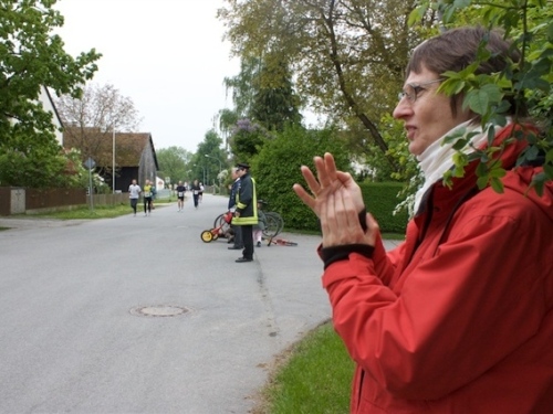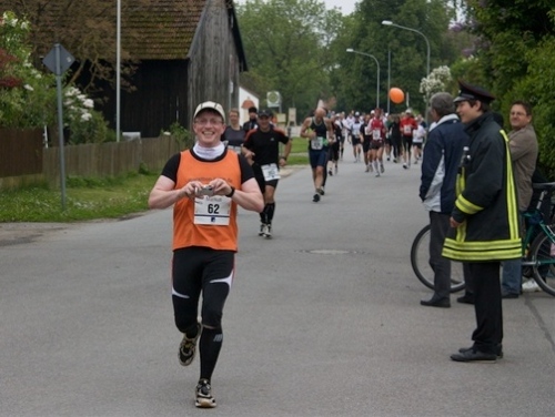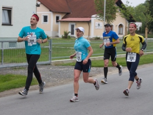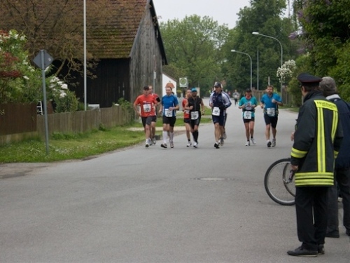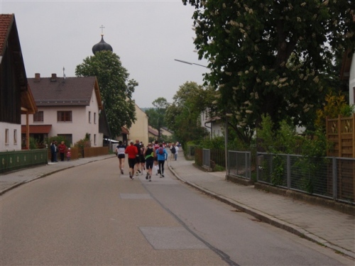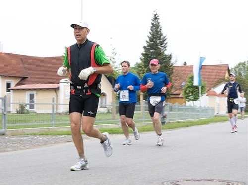 Kurz vor der Halbmarathonmarke war der Wendepunkt in Illkofen erreicht. Eine nicht unbedingt erfreuliche Überraschung ließ nicht auf sich warten: Sofort blies mir der Gegenwind ins Gesicht. War es wegen des Rückenwindes bisher so gut gelaufen? Diese kurze Überlegung schob ich gleich wieder zur Seite. Die geänderten Bedingungen hatten taktische Auswirkungen, Windschattenlaufen war angesagt. So zog ich auf den nächsten Kilometern erst mal Benno mit. Er war bereits in der letzten Woche auf dem Rennsteig unterwegs und wollte eigentlich eine Zeit um die vier Stunden laufen. Aber wie das so ist, wenn sich zwei finden, die sich gegenseitig ziehen, zumal in Sarching wieder frenetisch angefeuert, da werden angestrebte Zeiten schnell zu Makulatur. Da es uns zwei noch gut ging, liefen wir locker weiter zusammen.