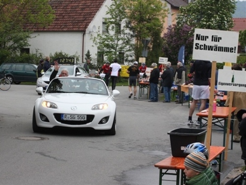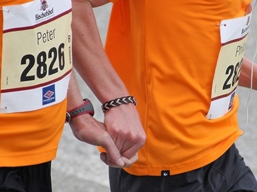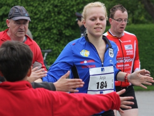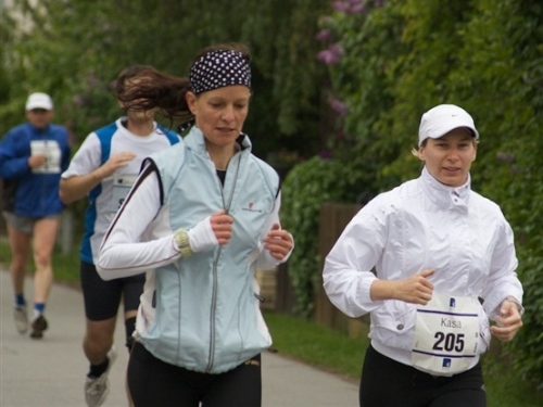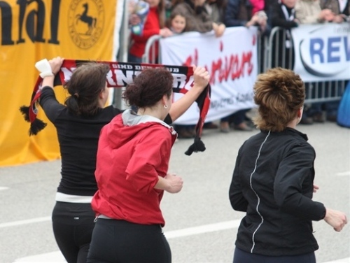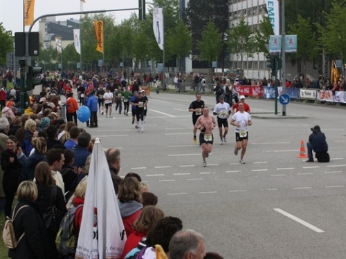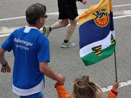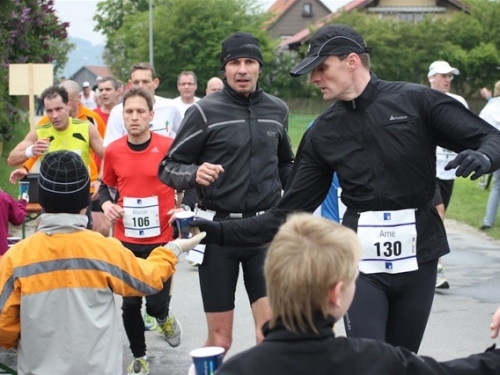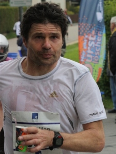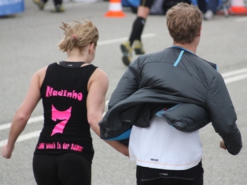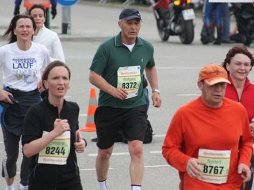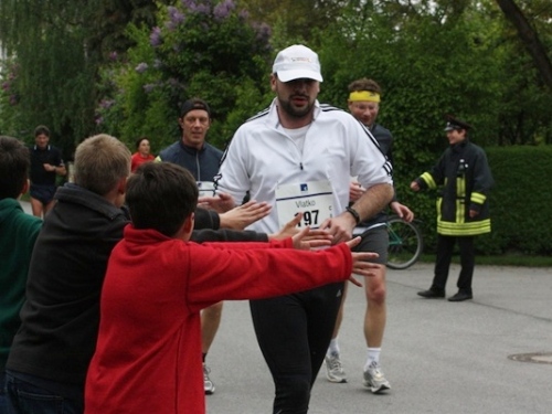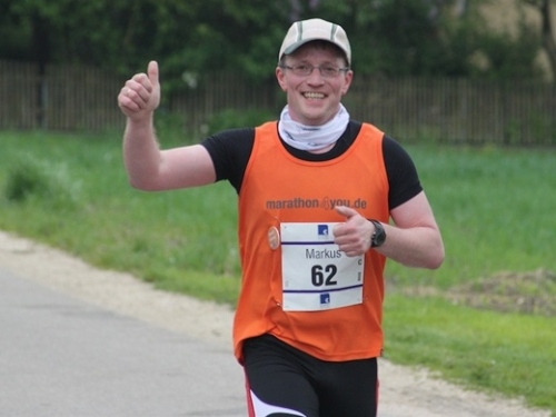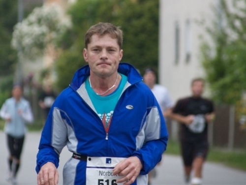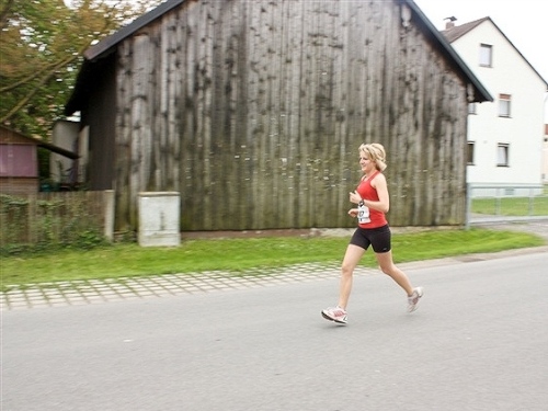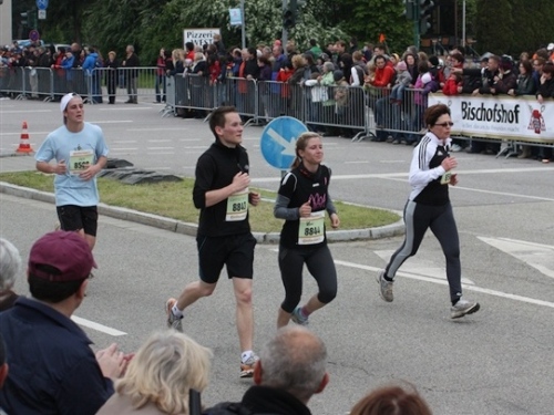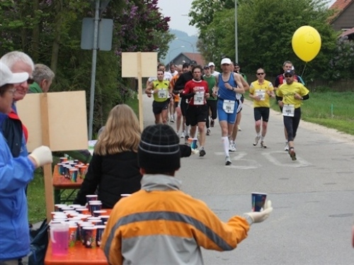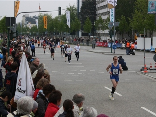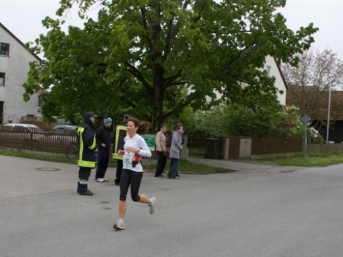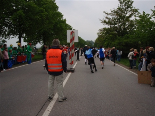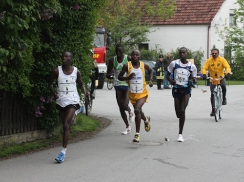 Kurz vor der Halbmarathonmarke war der Wendepunkt in Illkofen erreicht. Eine nicht unbedingt erfreuliche Überraschung ließ nicht auf sich warten: Sofort blies mir der Gegenwind ins Gesicht. War es wegen des Rückenwindes bisher so gut gelaufen? Diese kurze Überlegung schob ich gleich wieder zur Seite. Die geänderten Bedingungen hatten taktische Auswirkungen, Windschattenlaufen war angesagt. So zog ich auf den nächsten Kilometern erst mal Benno mit. Er war bereits in der letzten Woche auf dem Rennsteig unterwegs und wollte eigentlich eine Zeit um die vier Stunden laufen. Aber wie das so ist, wenn sich zwei finden, die sich gegenseitig ziehen, zumal in Sarching wieder frenetisch angefeuert, da werden angestrebte Zeiten schnell zu Makulatur. Da es uns zwei noch gut ging, liefen wir locker weiter zusammen.