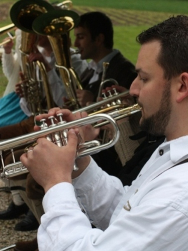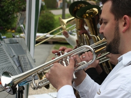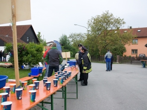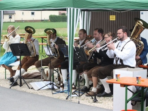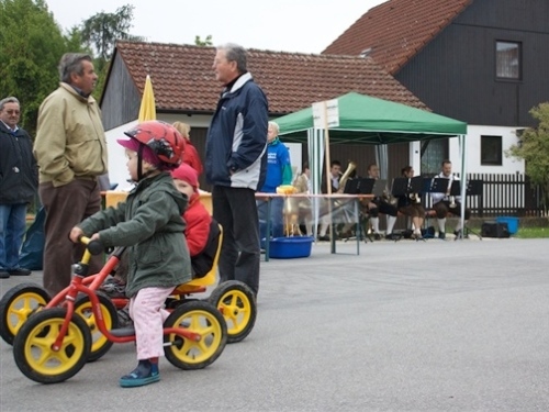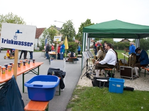 So kurzweilig und abwechslungsreich dieser Abschnitt durch die Altstadt auch war, so schnell war er auch leider durcheilt. Ab KM 5 ging es auf den nächsten Abschnitten abwechselnd durch Feld und Flur und die Ortschaften Barbing, Sarching, Friesheim und Illkofen. Aber wer meint, das wäre langweilig, der sei hier eines Besseren belehrt. Sowohl in als auch zwischen den Ortschaften sorgten zahlreiche Blaskapellen und Trommler für heiße Unterhaltung und Ansporn. Zudem traf ich bei KM 8 auf Sigi und Stefan. Letzter lief seinen ersten Marathon. Also doch noch ein Debütant. Natürlich war er neugierig auf einige Tipps und wir hatten auch Zeit für einige Anekdoten. Zwischenzeitlich passierten wir bei 10,5 KM den ersten Wechselpunkt der Marathonstaffel, die in diesem Jahr zum ersten Mal ausgetragen wurde. Die Teilnehmerzahl war allerdings noch sehr überschaubar, was daran gelegen haben mochte, dass man in Regensburg zusätzlich noch einen 10 KM-Lauf anbot.