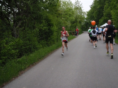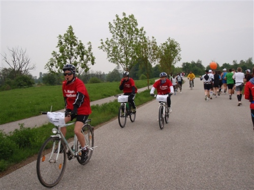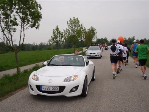 In Sarching wurden wir von Silke und Matthias in Empfang genommen. Zeit für einen Batteriewechsel der Kamera und schon ging es weiter. Auf Höhe des Sarchinger Sees kam mir bereits die Spitzengruppe entgegen. Gelegenheit für einen Fotostopp. Die Crew im Begleitfahrzeug erinnerte mich freundlich daran, dass ich doch laufen solle, was ich dann auch gerne wieder tat.