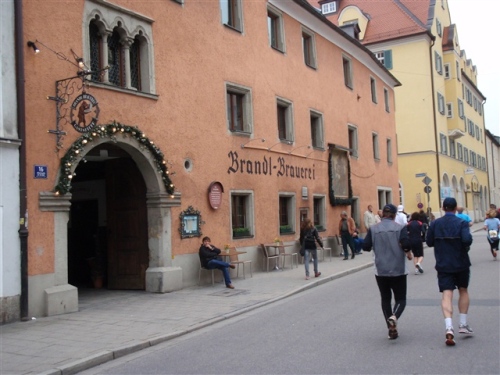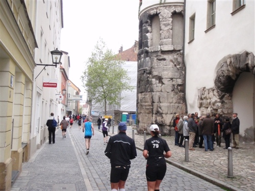 Die Strecke führte nun um den Dom. Rechtzeitig zum Marathon hatten die Regensburger letzte Woche die Statue des Bayernkönigs Ludwig I. hier wieder aufgestellt. Dieser förderte im 19. Jahrhundert die Stadt und ließ am gegenüberliegenden Ufer der Donau die Walhalla errichten. Die Stimmung in diesem Bereich war natürlich besonders gut. Nach einer kleinen Schleife an der Donau entlang ging es nun gegenüber der Steinernen Brücke, die wegen Restaurierungsarbeiten erstmals nicht überquert werden konnte, Richtung Goliathstraße und Rathaus.