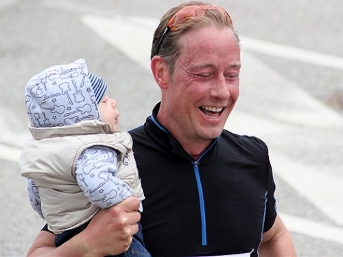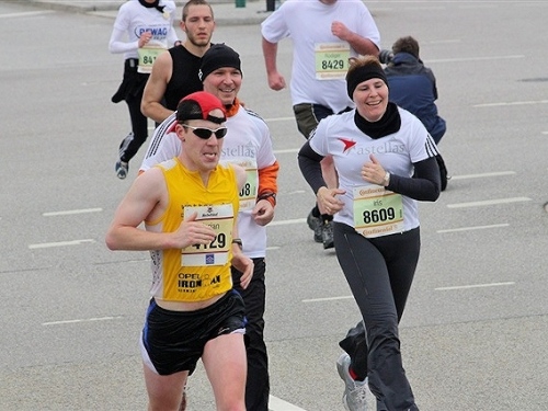 Wie Sieger gefeiert wurden auch wir und so auf die letzten 2,5 Kilometer geschickt. Ab jetzt konnte mal wieder nichts mehr schief gehen. Und wen traf ich kurz vor KM 40 wieder? Marathon-Debütant Stefan! Dafür, dass er „nur“ unter vier Stunden laufen wollte, war er gut unterwegs und noch super drauf. Da fiel mir das Laufen auch wieder etwas leichter und ich freute mich, doch noch das erfolgreiche Ende einer Marathonpremiere miterleben zu dürfen. Der Rahmen dafür war dann auch mehr als würdig, als uns die Zuschauer auf den Tribünen im Zielbereich jubelnd empfingen. Auch den Sigi sahen wir gleich im Ziel wieder.