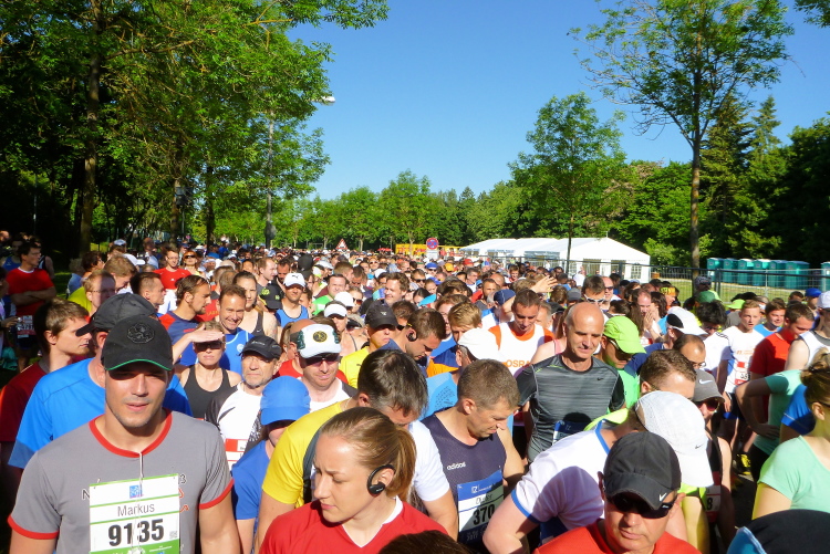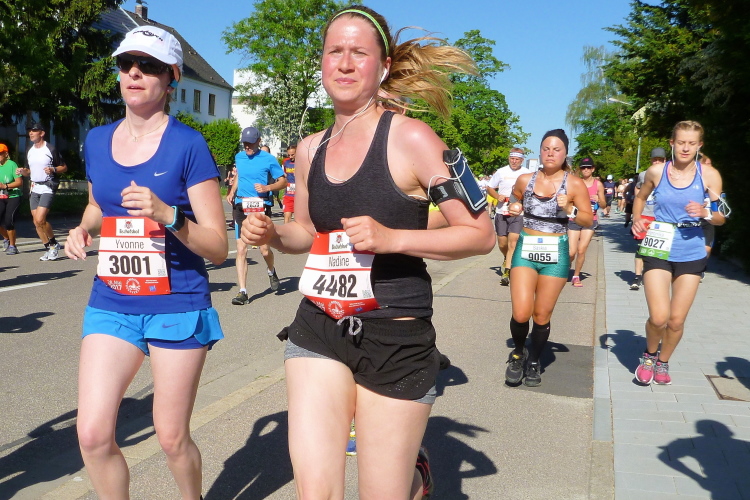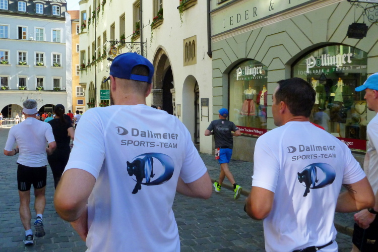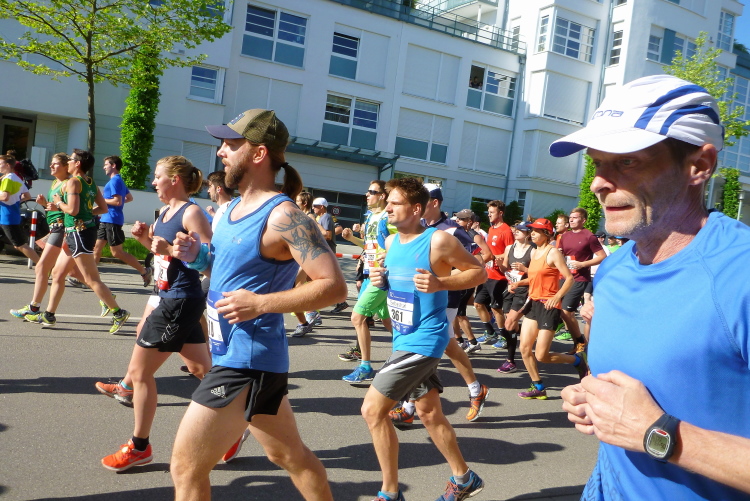 Vom Start bin ich ein Stück weit weg, kriege aber den Countdown mit. Bürgermeisterin Gertrud Maltz-Schwarzfischer entlässt uns mit einem Schuss aus der Starterpistole auf die Strecke. Nur ganz langsam nähern wir uns den Zeitmessmatten. Mit einer Verzögerung von gut 1,5 Minuten gehe ich im Schlepptau des Vier-Stunden-Pacers auf den Parcours. Gut 3000 Läufer sind nun unterwegs.
