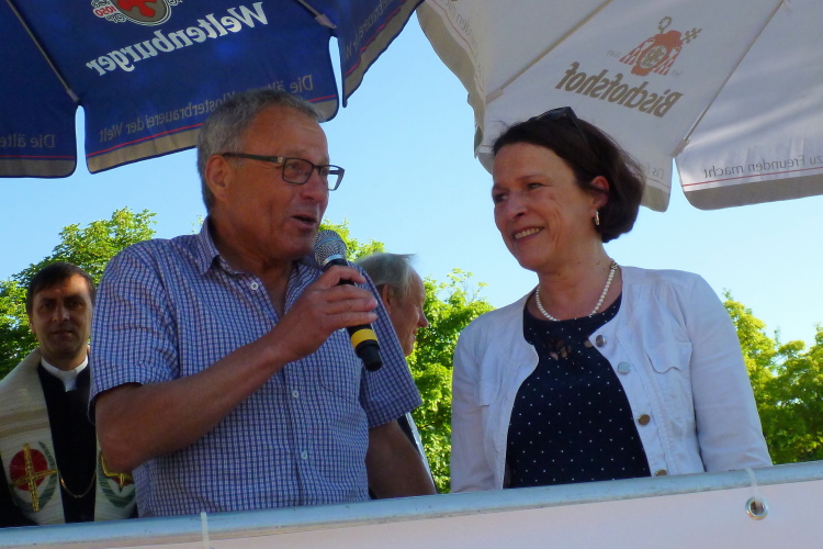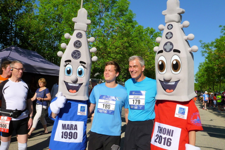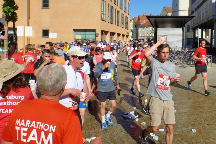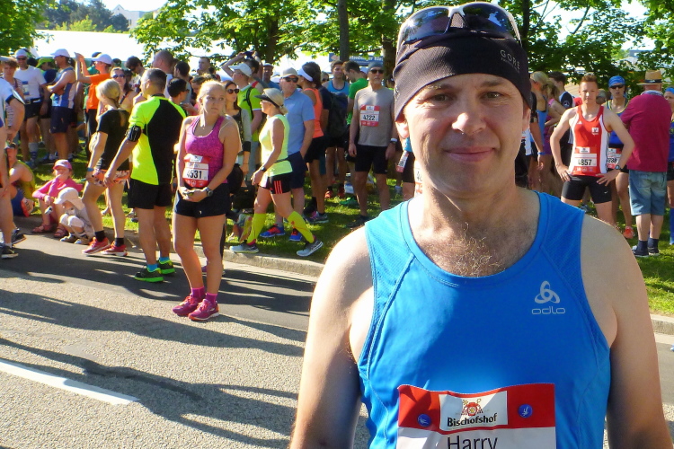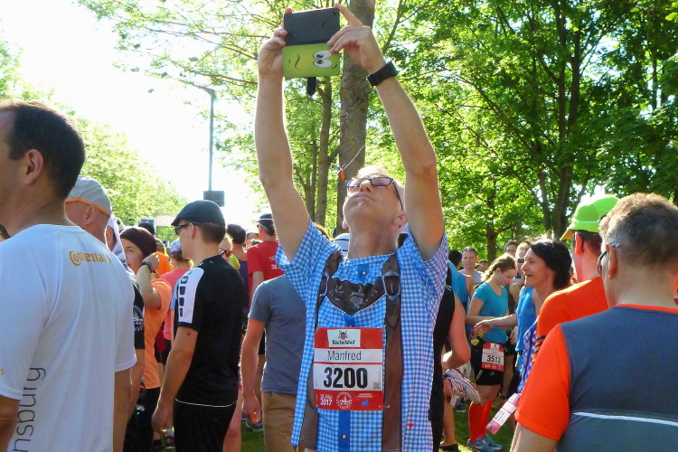 Der erste, der mir im Anmeldezelt über den Weg läuft, ist der kilometerfressende Roland Krauss, erst vor ein paar Tagen hat er einen langen Kanten hingelegt. Mir läuft noch Vereinskollege Harry Frese, Roland Blumensaat, Anton Luber sowie einige Marathonis aus Rannungen über die Weg. Letztere haben es sich noch im Schatten zwischen den Lkws bequem gemacht. Aus gutem Grund, denn die Sonne strahlt makellos vom blauen Himmel. Es wird heute ein heißer Tanz werden, die Celsiussäule wird an der 30 Grad-Marke kratzen. „Trinkt genug und wartet nicht, bis ihr Durst bekommen“, weist Moderator Armin Wolf wiederholt hin. Und dann bekommen wir noch mit, dass zusätzliche Erfrischungsstellen eingerichtet wurden. Alle vier Kilometer werden wir versorgt und gekühlt.