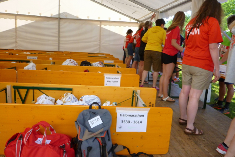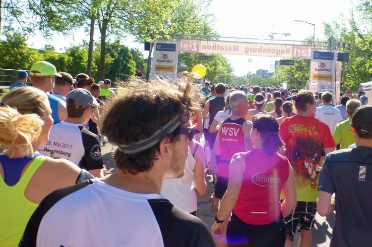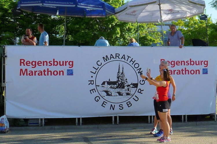 Da am Startgelände beim Westbad nur begrenzt Parkplätze zur Verfügung stehen, wird ein Shuttleverkehr eingerichtet, der vom KÖWE-Center und vom Parkhaus beim Zweirad Stadler angeboten wird. Einen weiteren Bus kann man vom Hauptbahnhof benutzen. Ich fahre dieses Mal mit dem Zug, denn ein wenig mehr als eine Stunde Fahrzeit dauert meine Reise bis zum Vorortbahnhof Regensburg-Prüfening. In wenigen Minuten bin ich dann vor Ort, wo am Startgelände schon voller Betrieb zu sehen ist. Die Tische und Bänke im Freien sind schon gut von den Läufern in Beschlag genommen. Es wird umgepackt, die Startnummern angeheftet und Riegel einsteckt. Gleich nebenan können die Kleidersäcke im Zelt (für die Halbmarathonis) oder in den Kleintransportern der DHL abgegeben werden. 30 Minuten vor meinem Start um 08.30 Uhr gebe ich meinen Rucksack ab.