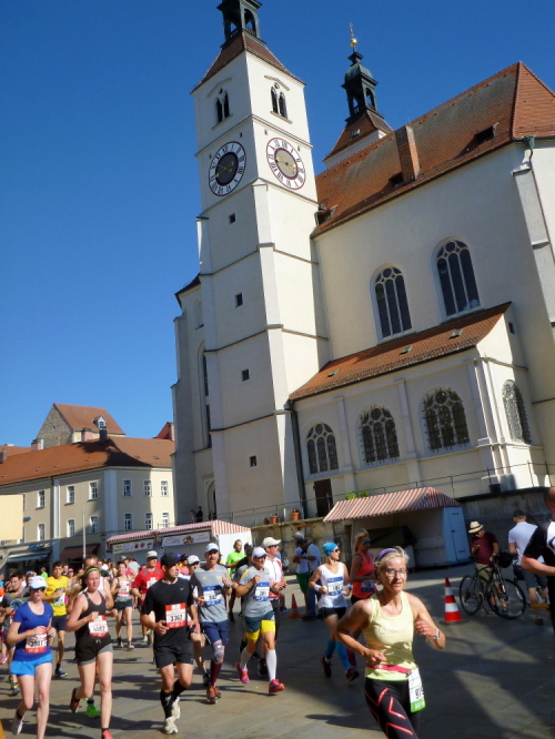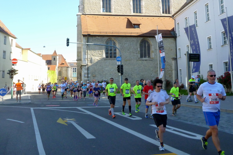 Das Jakobstor bildet die westliche Grenze der Regensburger Altstadt. An vier Portalen konnte man im Mittelalter die Reichsstadt betreten. Aus dem 13. Jahrhundert stammt die Stadtbefestigung und wir dürfen heute da hineinlaufen. Das Feld ist weiterhin dicht zusammen, ein wenig Konzentration braucht man, damit man dem Vordermann nicht auf die Fersen steigt.
