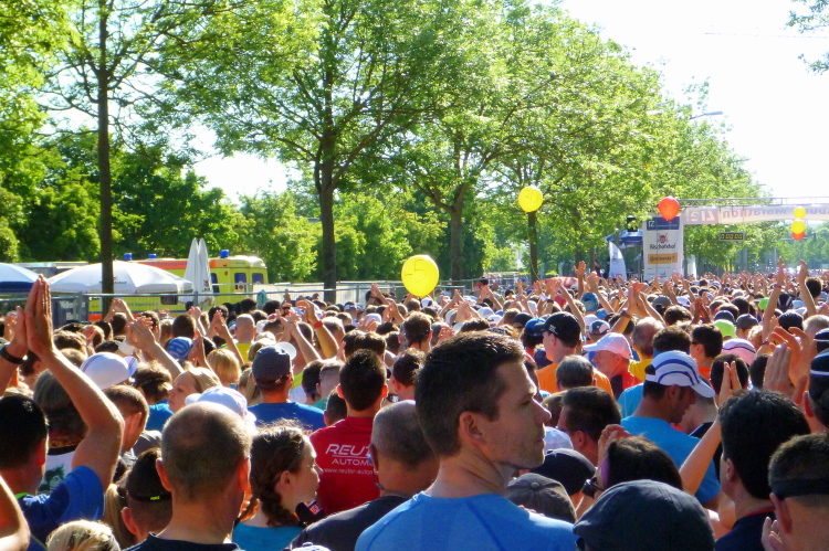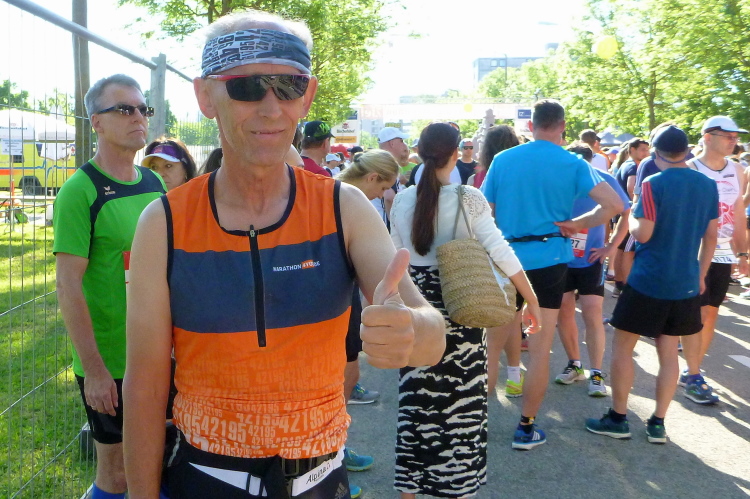 Einen Schnellstart will ich nicht hinlegen, deswegen gehe ich in Richtung des 4-Stunden-Pacers (weitere Zeitläufer vorhanden). Ich werde mich da hinten dran klemmen und schauen, wie mein Rennen verläuft. Aber mit Gewalt hier eine bestimmte Zeit zu erreichen, das steht nicht auf meinem Plan. Es wird später schlicht zu heiß. Auch wenn es jetzt im Schatten mit rund 20 Grad noch angenehm temperiert ist.
