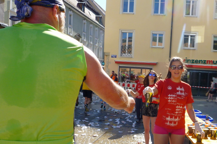 Unsere Wallfahrt führt uns nach einem Schlenkerer am Alten Kornmarkt und einer kurzen Einkehr an der ersten Tankstelle (Wasser, Isogetränke) in Richtung Domplatz. Die Helfer sind schwer beschäftigt mit dem Ansturm und haben alle Mühe, unseren Wünschen nachzukommen. Ich bemerke nun meinen Lapsus. Ich habe den Wasserschwamm in der Startertüte liegengelassen.