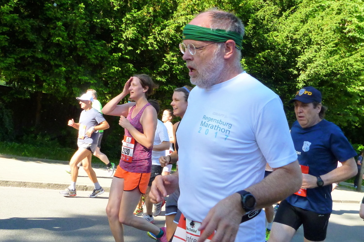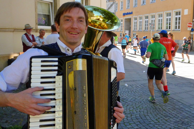 Nach den ersten Abbiegemanövern auf der Puricellistraße und dem Hochweg, noch vor Kilometer eins, werden wir musikalisch von der Band „Second Unit“ unterhalten. Das ist aber nicht die einzige Musikdarbietung. In Regensburg sind 15 Band und zwei Moderatoren für die Streckenunterhaltung verpflichtet worden. Viele junge Musiker und auch ältere Musikanten sind da drunter. Von der Stilrichtung von Rock, Jazz und Quetschnrock ist alles vorhanden. Fast Freiburger Verhältnisse.