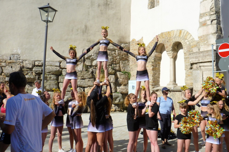 Der Altstadtkurs führt nun am Kolpinghaus St. Erhard vorbei, wo ein Moderator versucht, möglichst viele Läufer zu benennen und abzuklatschen. An der Ecke zeigen Cheerleader-Mädchen ihr Können. Eine kleine Welle bringt uns nun hoch zum Schwanen- und zum Dachauplatz. Die Freifläche diente hier früher dem Militär, daher der Name Exerzierplatz im 19. Jahrhundert. Erst nach dem Zweiten Weltkrieg wurde im Gedenken an die Opfer des NS-Regimes die Fläche Dachauplatz genannt. Der Domprediger Dr. Johann Maier, der Lagerarbeiter Josef Zirkl und der Polizeiinspektor Michael Lottner wurden hier in den letzten Kriegstagen von den NS-Schergen umgebracht, weil sie die Stadt den Amerikanern kampflos überlassen wollten. Ein Mahnmal erinnert an das fürchterliche Unrecht. Das Historische Museum, das Neue Rathaus und die Minoritenkirche umrahmen den Dachauplatz.