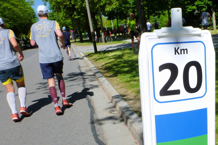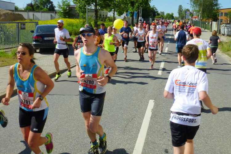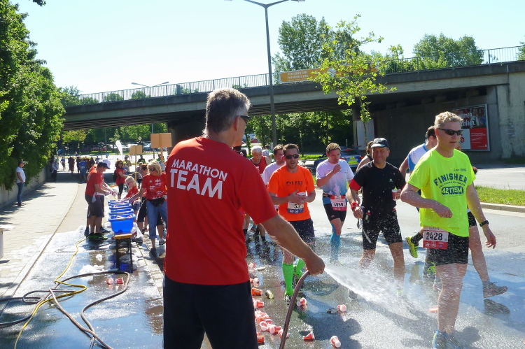 Die Kilometer fliegen dahin, noch, denn es ist deutlich wärmer geworden. An jeder Wasserstelle kippe ich mir einen Becher über die Birne. Das erfrischt. In der Altstadt haben wir wenigstens etwas Schatten, aber dann im Osten, jenseits des Ostentors ist es damit vorbei. An einigen Tankstellen sitzen Helfer mit einem Wasserschlauch in der Hand und spritzen uns ab. Der Wendepunkt in der Siemensstraße ist noch weiter nach hinten gerückt, übel. Dann dürfen wir auf den Prüfkurs. Kurz vorher ist mir der 3.45 Stunden-Pacer entgegengekommen, den mit dem vier Stunden sehe ich nicht. Allerdings stand ein Zeitläufer vor geraumer Zeit am Straßenrand. War es vielleicht der Mann für die vier Stunden?