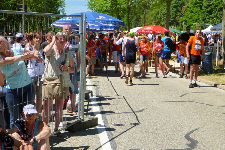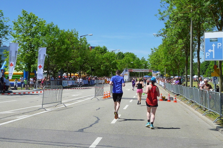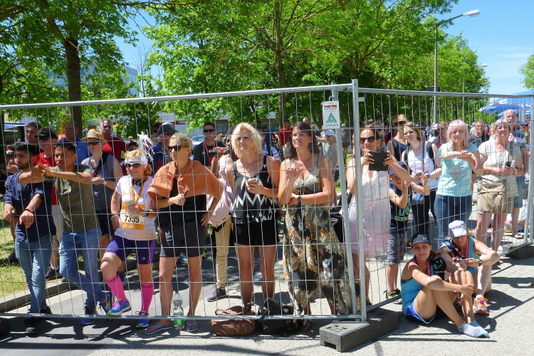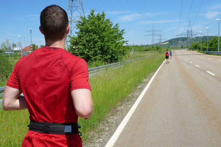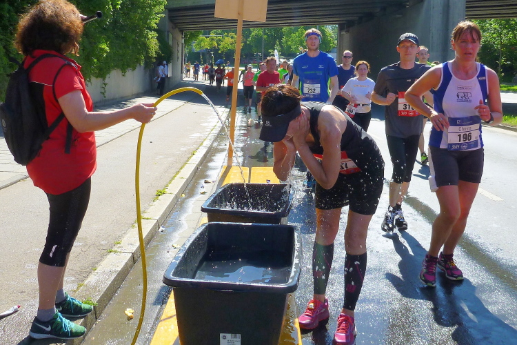 Noch gut zwei Kilometer, dann endet die erste Runde. Ich habe bisher einige ärztliche Einsätze sehen müssen. Einige sind vermutlich zu schnell bei der zunehmende Wärme ins Rennen gegangen, oder haben zu wenig getrunken. Hoffentlich hält sich das in Grenzen. Vorbildlich für die Helfer und Zuschauer, denn überall waren schon Hilfeleistende bei den Läufern, die hilfebedürftig waren.
