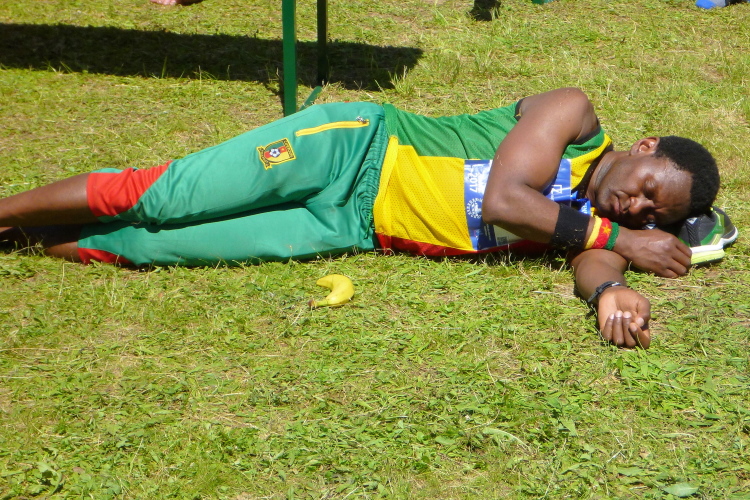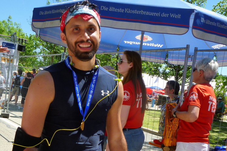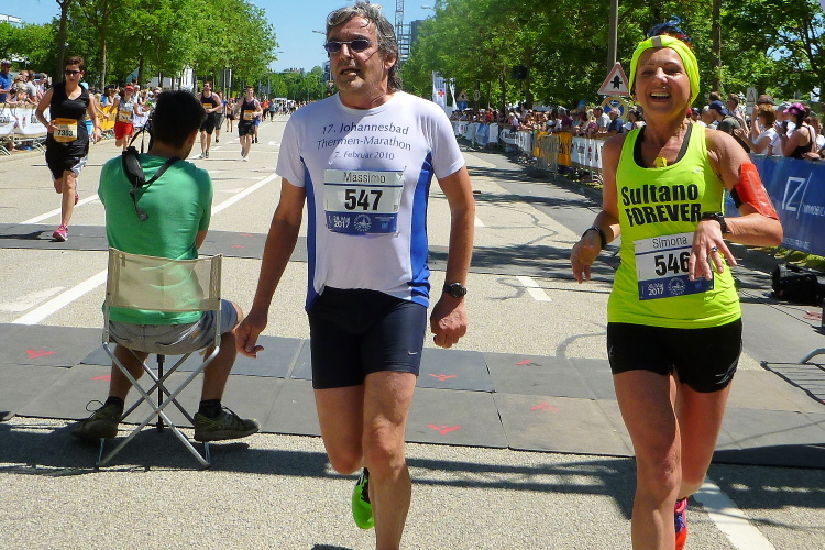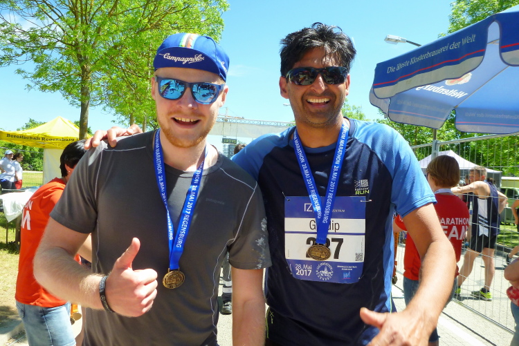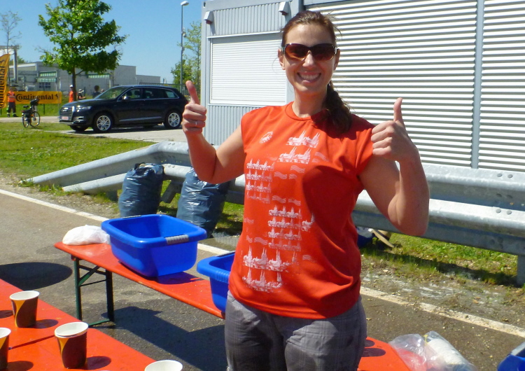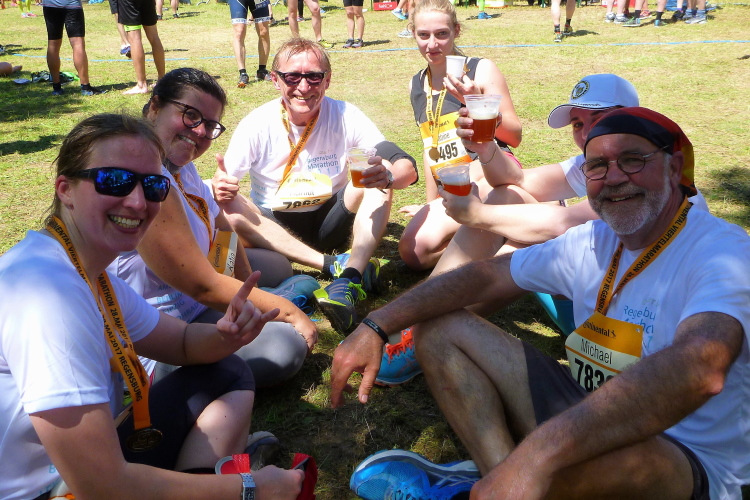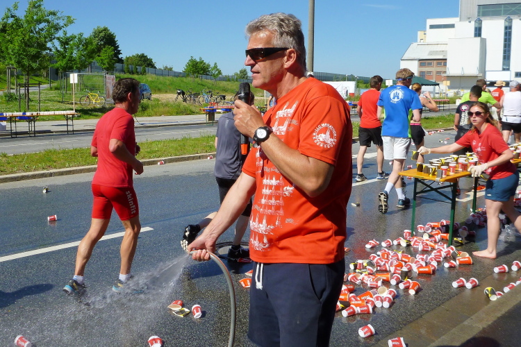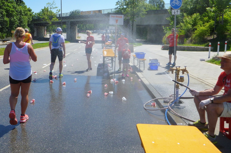 Dort warten jetzt die Medaillenmädels mit dem edlen Medaillenblech. Kurz hinter der Ziellinie erhalten wir Cola, Wasser, Iso, Obst und endlich alk-freies Weltenburger Weißbier. Nach ein paar Minuten erscheinen auch Gerhard Wally, Anton Luber und Roland Blumensaat. Nachdem mein Job als Fotograf im Ziel erledigt ist, widme ich mich der aktiven Erholung, das die Österreich-Connection an einer Ecke schon seit geraumer Zeit betreibt. Nach fünf Bier (ich übertreibe nicht) ist der gröbste Durst gestillt. Duschen können wir im Westbad und Nudeln gibt es nach Zielschluss auch noch im Übermaß.