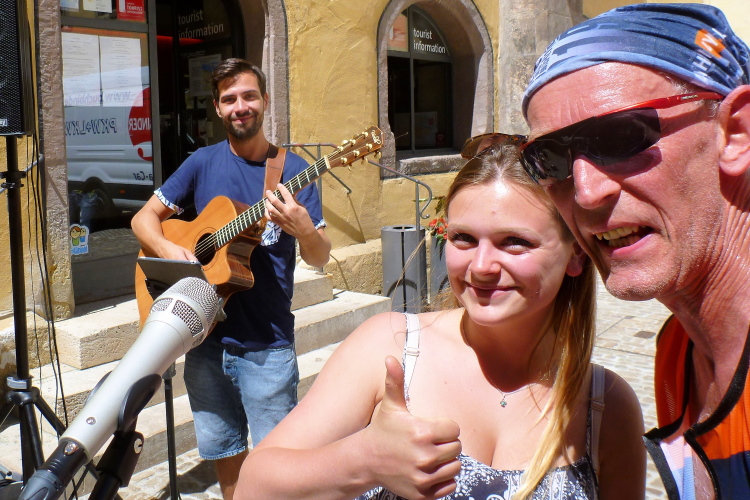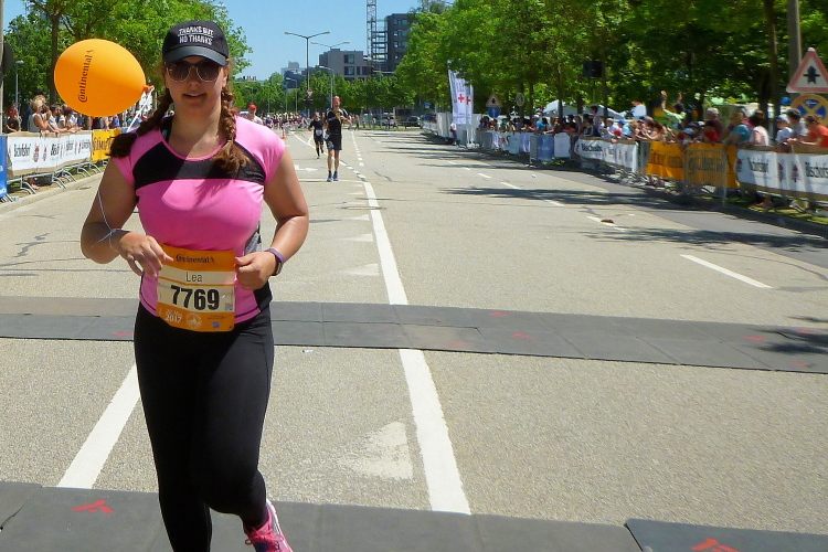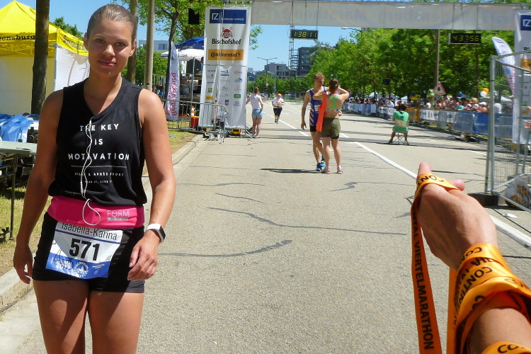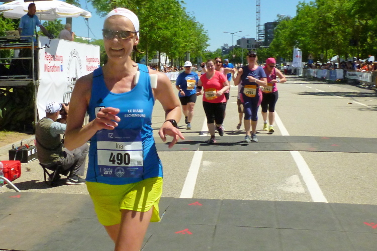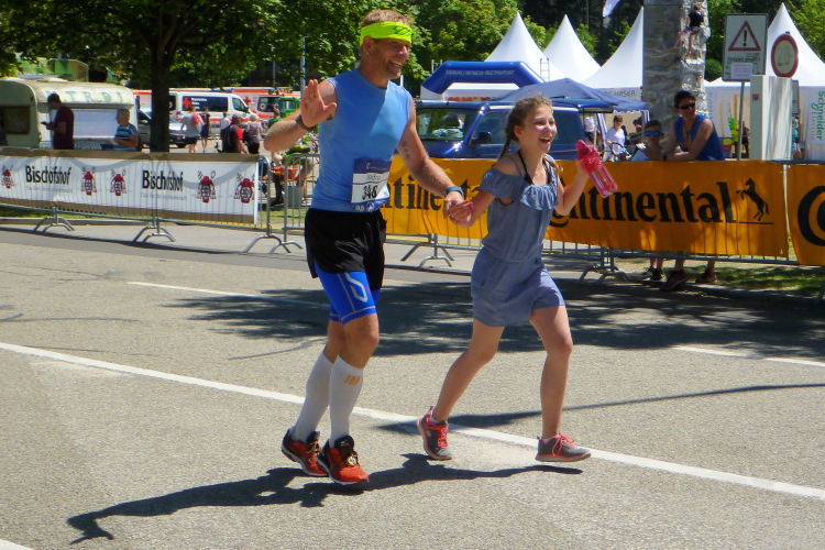 Die Hitze wird zunehmend unerträglich, jeder Schatten wird ausgenutzt. Ich kann immer noch die Kurzstreckler überholen, die müssen sich genauso anstrengen und leiden. Auffällig ist, dass jetzt wieder einige Notarzteinsätze gefahren werden müssen. Dann biege ich endlich auf den Weinweg ein, der mich nach einer Viertelstunde in Richtung Westbad entlässt. Da vorbei und ich darf zum Ziel einschwenken. Ich sehe, dass die Bruttozeit gerade noch ein paar Sekunden unter 4.15 Stunden liegt. Ein harter Brocken heute.