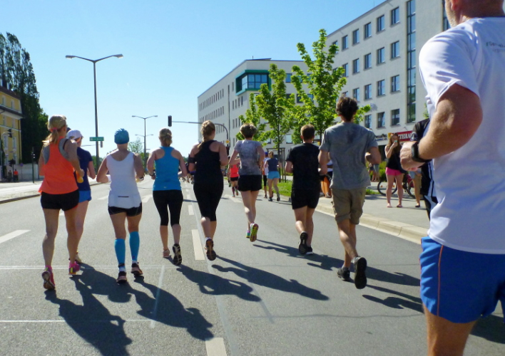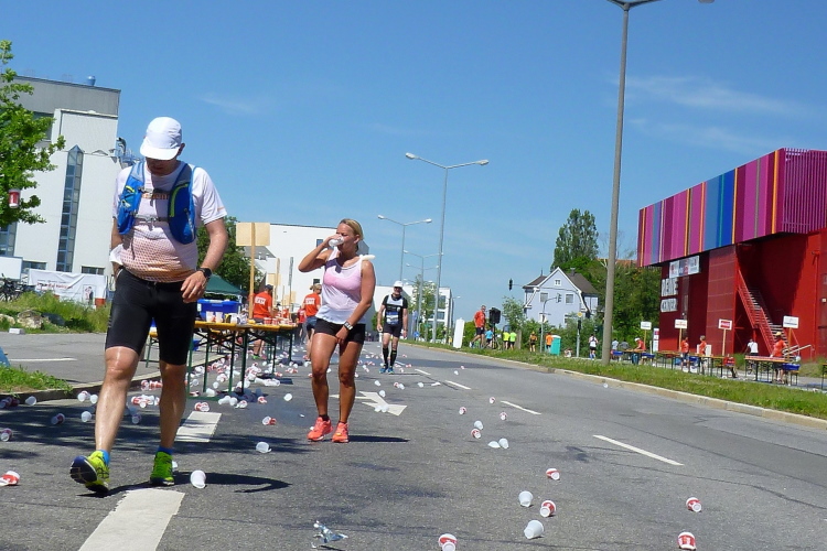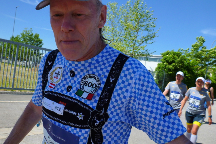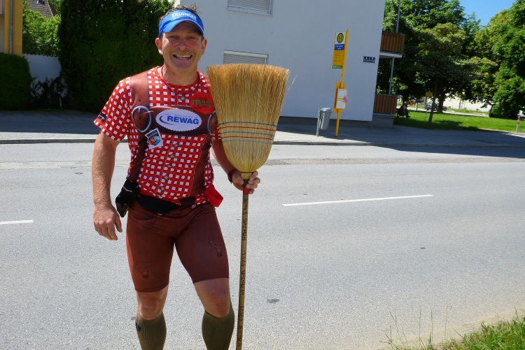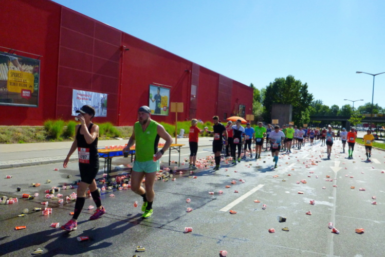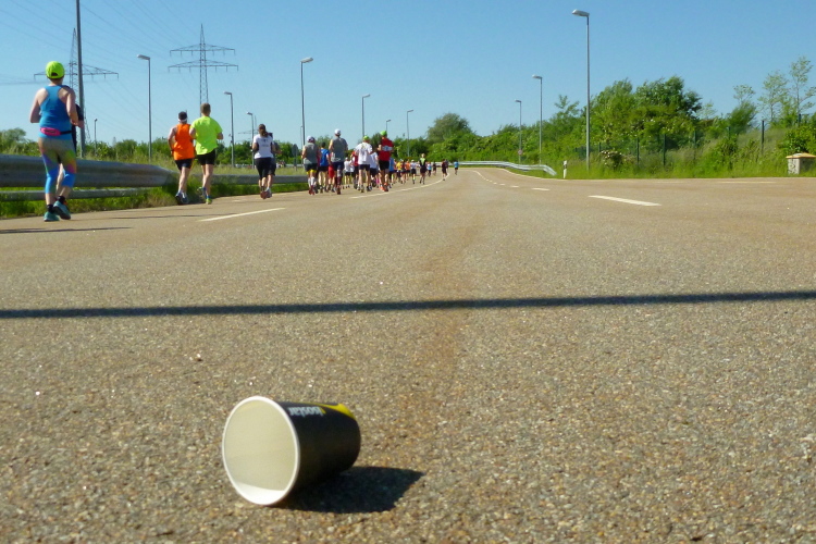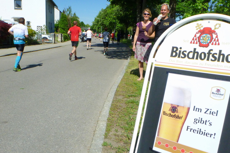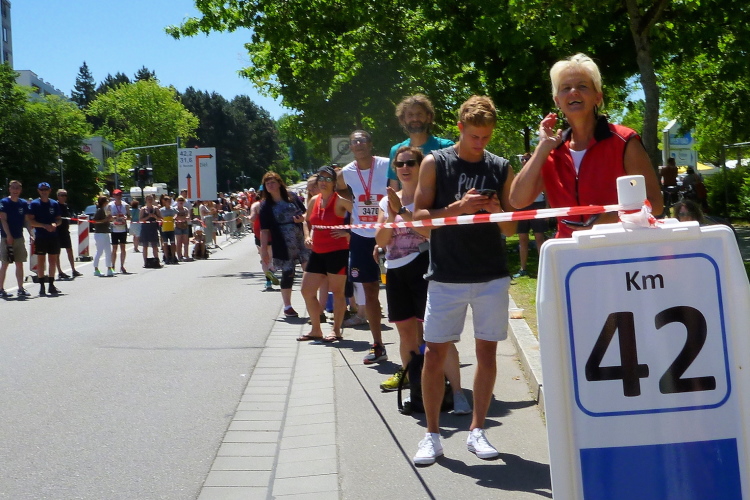 Auf der anderen Seite der Straubinger Straße kommt dann der Besenläufer entgegen. Der Tom hat den Job übernommen, denn normalerweise will keiner der Letzte sein. Bei einer Band schnorre ich mir ein Bier, der Musiker grinst und überreicht mir … eine leere Flasche. „Leer“, sagt er und ich schleiche durstig von dannen. Auch bei mir ist jetzt der Dampf raus. Ich schleppe mich von Kilometer zu Kilometer weiter. Wenigstens geht es noch joggend. Andere sind zum Wanderer oder Spaziergänger geworden.