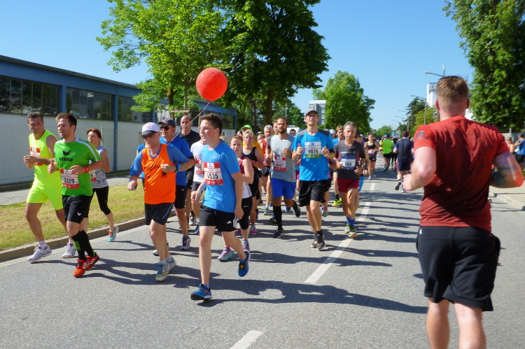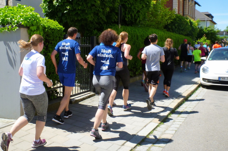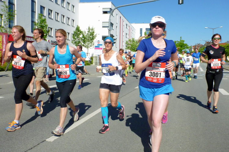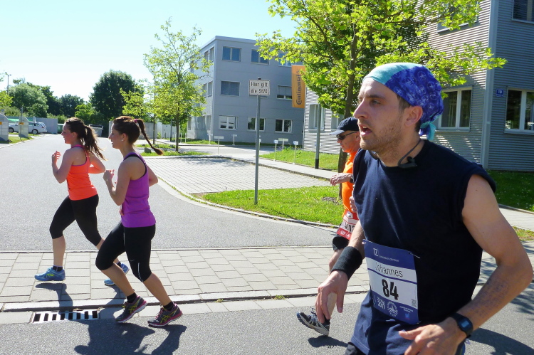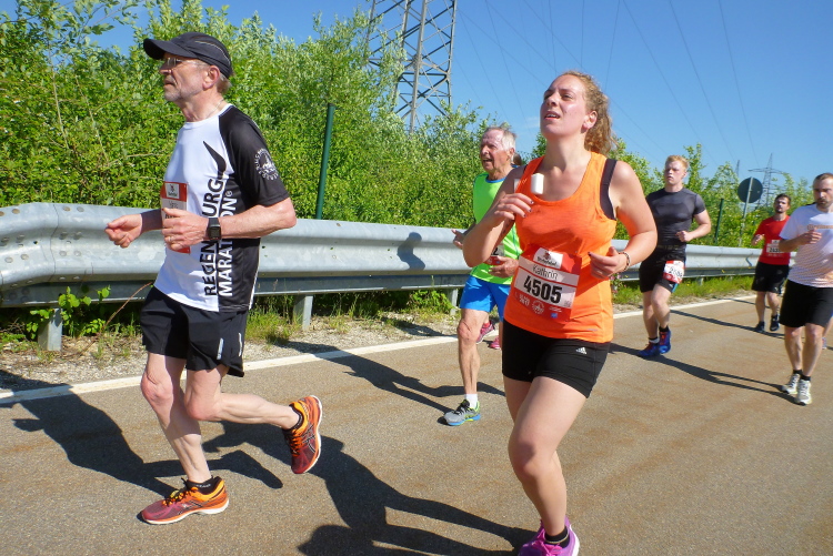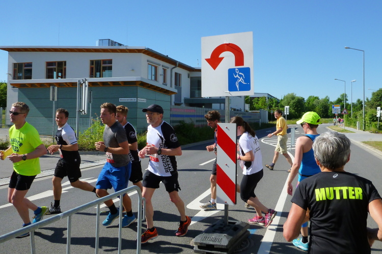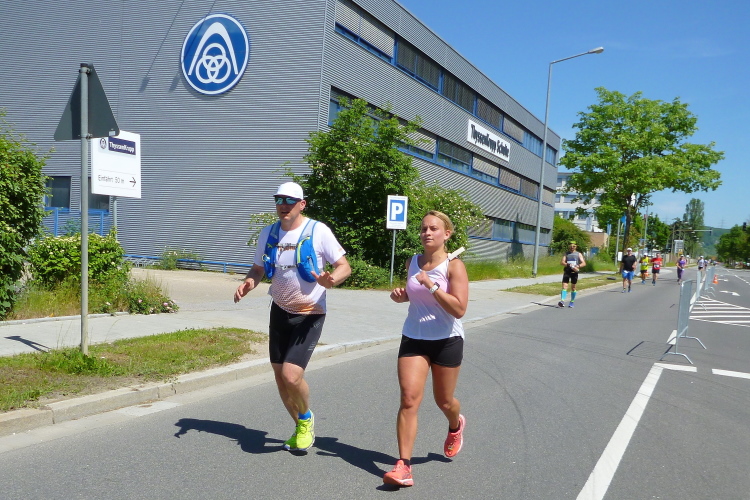 Ein längeres Stück laufen wir nun auf der Straubinger Straße, die uns in Richtung Businesspark führt. Die vier vom Lauftreff des SC Oberölsbach bemerken mein Treiben und nehmen mir die Kamera ab zum Gegenschuss. Kurzzeitig verliere ich sie dann aus meinem Blickfeld. Dafür laufe ich auf Udo Pitsch auf, der vor wenigen Tagen den Über-Drüber-Ultramarathon im Kirchdorf gemeistert hat. Fast 2000 Höhenmeter hat der Brocken und Udo hat schon wieder Power. Er wird heute bei der Hitze einen negativen Split schaffen, Respekt.