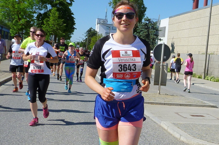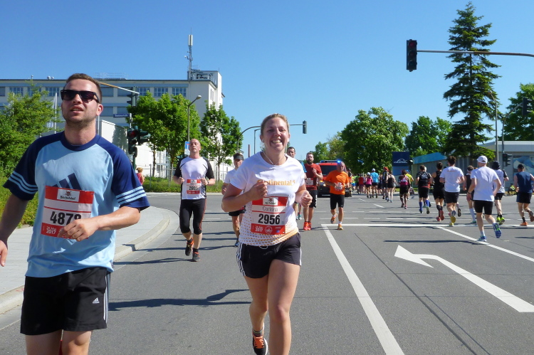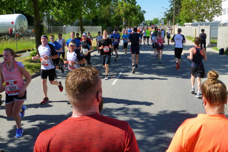 Auf der Siemensstraße haben wir einen Wendepunkt zu belaufen. Da kann man seine Verfolger gut beobachten, oder Pläne schmieden, wie man die vor einem Laufenden einholen kann. Vereinskollege Harry Frese ist mir gut voraus, denn er kommt auf der anderen Seite entgegen. Er bemerkt mich nicht, erst auf einen lauten Zuruf. Am Ende des Wendepunkts laufen wir über eine Zeitmatte. Den Halbmarathon laufen zusammen eine Mutter und ein Söhnchen, ein interessantes Wortspiel. Vorne sehe ich bei beiden ein Super Girl und nochmal ein Muttersöhnchen. Dann schließe ich auf Roland Blumensaat, den Begleitläufer von Anton Luber mit seinem Handicap auf. Die beiden vertreiben sich den Marathon mit Unterhaltung, was den Marathon betrifft, den Untergrund und was es dann an der V-Stelle so zum Erfrischen und Stärken gibt.