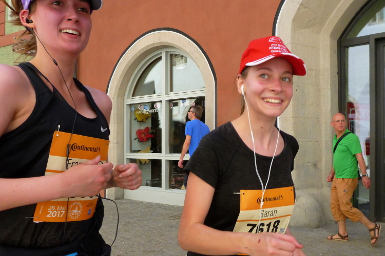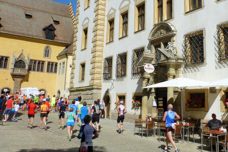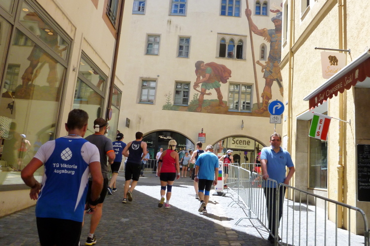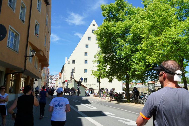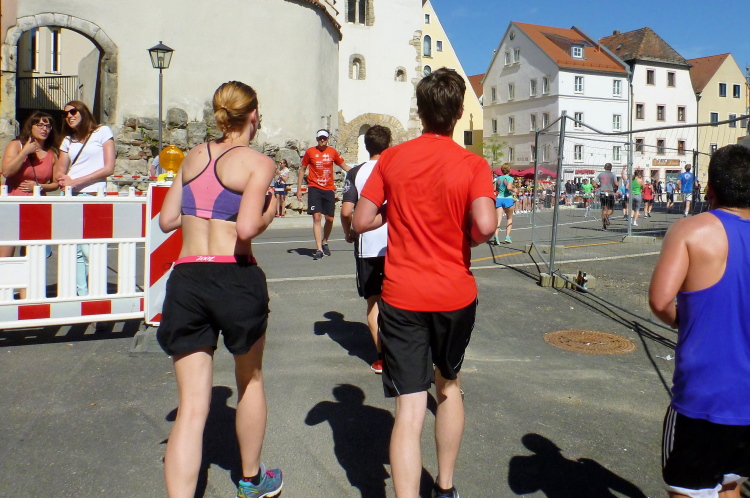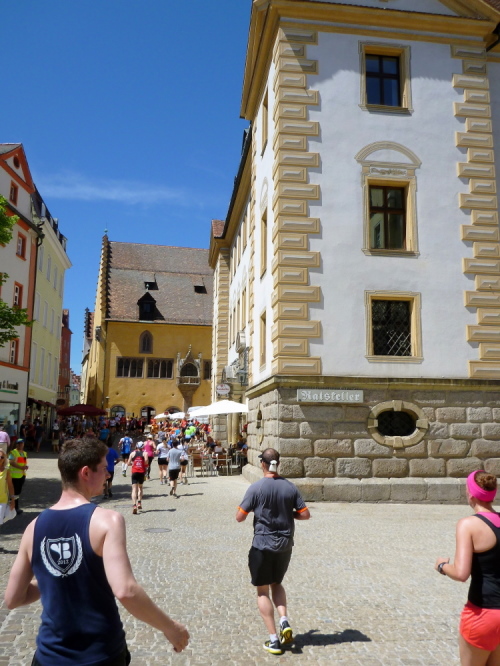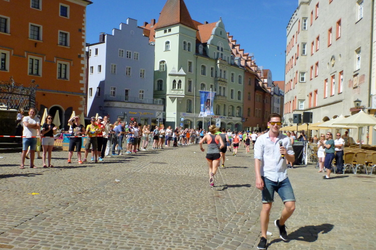 Auf der Ostengasse laufen wir bis zum St. Georgs-Platz, wo ein Moderator das Rennen auf unserer und auf der anderen Seite kommentiert. Auf der Thundorfer Straße rennen wir bis zur Steinernen Brücke. Ich springe kurz nach rechts, um ein Bild der Steinernen Brücke zu bekommen, die Besucher der Wurstkuchl schauen. Nächstes Jahr sollen die Renovierungsarbeiten der im 12. Jahrhundert erbauten Steinernen Brücke enden. Das über 800 Jahre alte Bauwerk wird nämlich seit 2010 saniert. Probleme in der Gesteinsfindung und in der Bauausführung sorgen für eine erhebliche Verspätung in der Bauausführung. Vielleicht dürfen wir dann wieder drüber, das würde zum Gesamtkonzept bestens passen. Und auf der Höhe der Brücke biegen wir wieder links in das Altstadtzentrum ab. Es geht einige Höhenmeter empor. Die ersten Läufer müssen gehen.