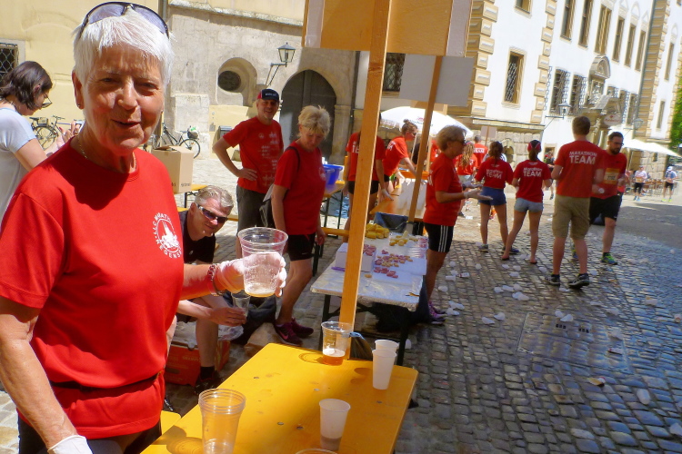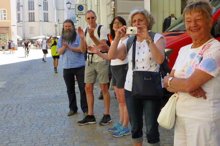 Das Alte Rathaus ist der nächste Höhepunkt. Im 13. Jahrhundert wurden die ersten Teile erbaut. Im Reichssaal tagte der „Immerwährende Reichstag“, der fast 200 Jahre andauerte. Die Delegierten hatten damals schon ein gehöriges Sitzfleisch. Einige Besucher des Ratskellers sind jetzt, kurz nach 10 Uhr noch beim Frühstück. Unser Frühstück beschränkt sich auf Iso, Wasser und Cola. Doch halt, Weltenburger schenkt Bier aus. Aber die Bedienung ist nicht da, so dass der durstige Fotograf sich an ein paar Noagerln halten muss.