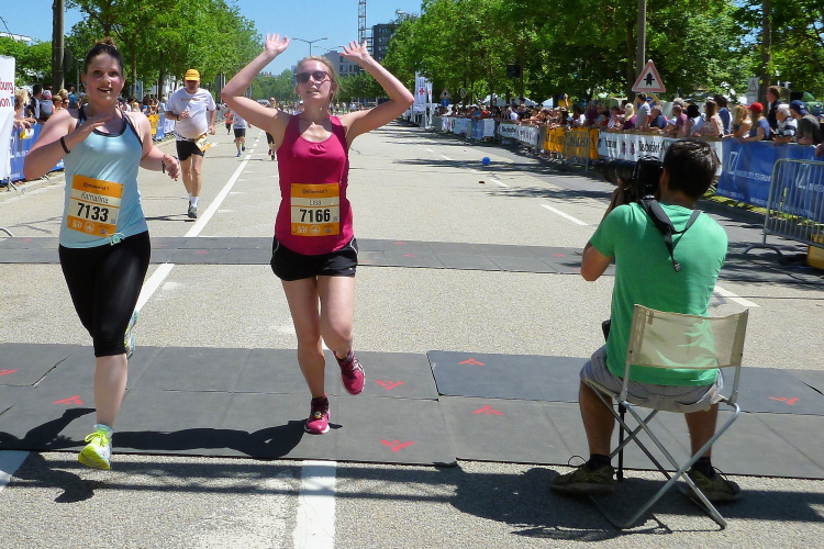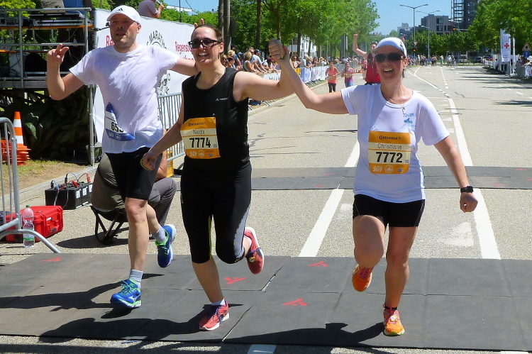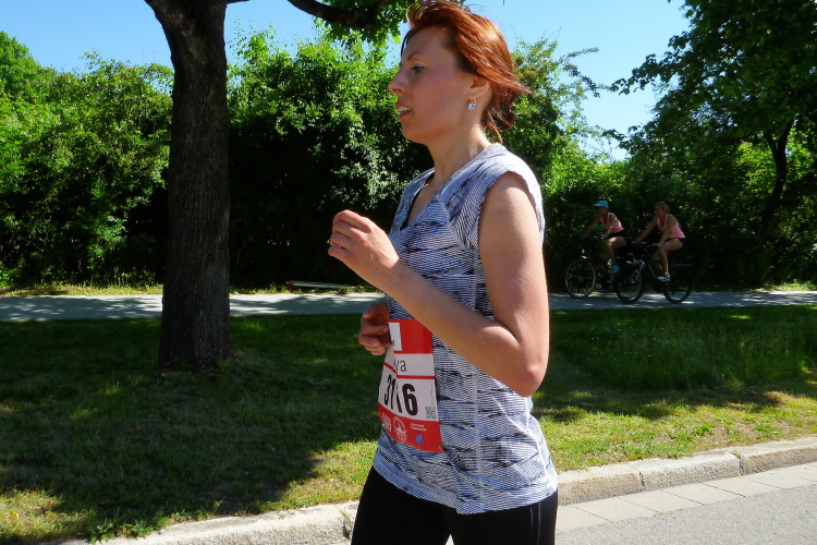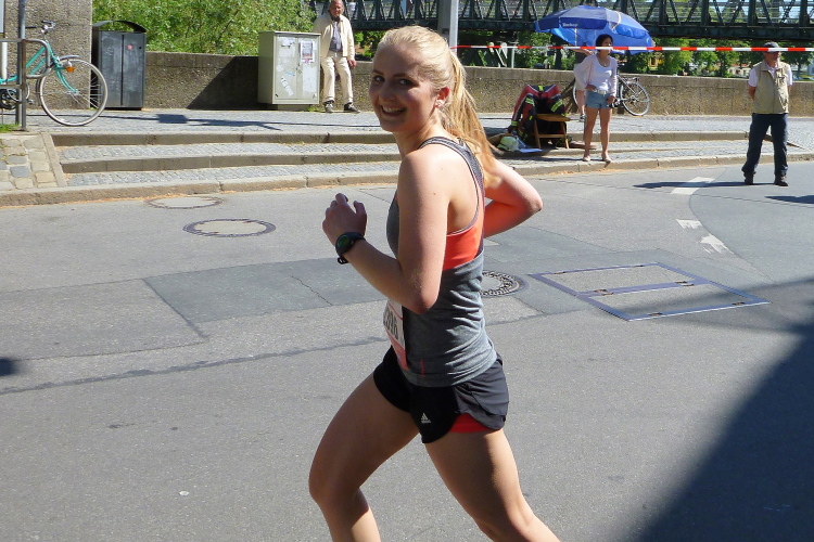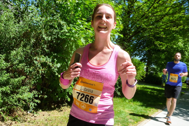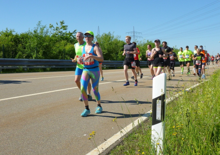 Auf dem langen Weinweg laufen wir nun auf dem parallelen Radweg, der größtenteils durch die Bäume beschattet wird. Das Feld sortiert sich langsam. Für die einen ist das Schöne in zehn Minuten vorbei. Nur die Marathonis dürfen weiter genießen. Frühzeitig werden wir eingewiesen. Für die einen heißt es rechts ab zum Zielspurt, wir dürfen geradeaus laufen.