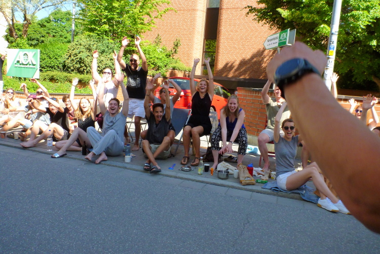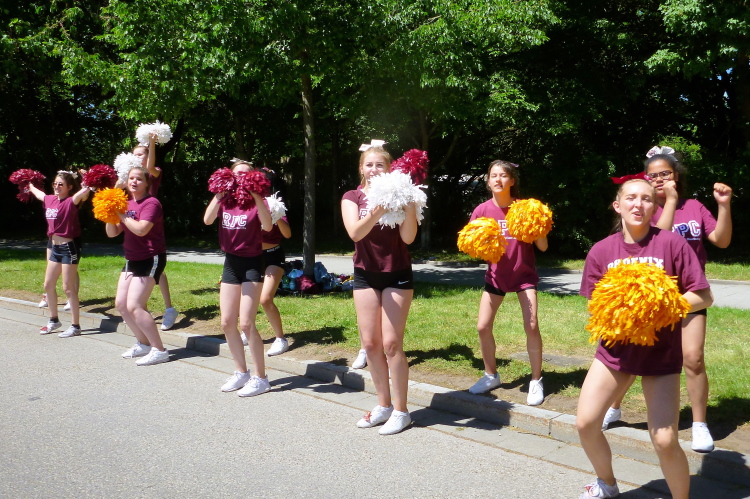 Die meisten Läufer scheren in Richtung Ziel aus, ich tippe mal auf ein Verhältnis von fünf zu eins. Die Band bei Kilometer 22 ist fleißig weiter am Spielen, toll. Am folgenden Hochweg haben sich Kinder und Erwachsene mit Wasserpistolen postiert. Auf mein Nicken kriegen wir eine Wassersalve ab, die kurz erfrischt. Für einige wenige Bilder bleibe ich stehen. Besonders die Cheerleader-Mädchen drücken sich an mich bei einem Selfie.
