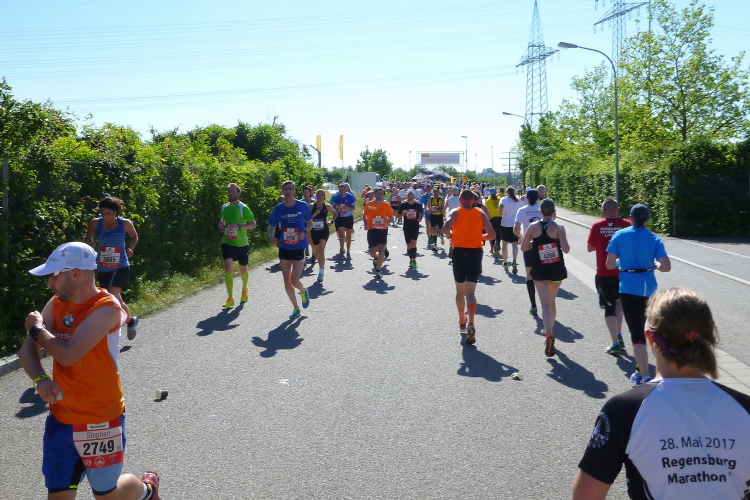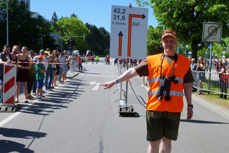 Zurück auf der Straubinger Straße kommt mir auf der anderen Seite ein Läufer entgegen, der schon rund fünf Kilometer weiter ist. Kurz danach schon der erste Pacer, der noch eine Schar Drei-Stunden-Läufer oder 1.30-Läufer auf dem Halben hinter sich her zieht.