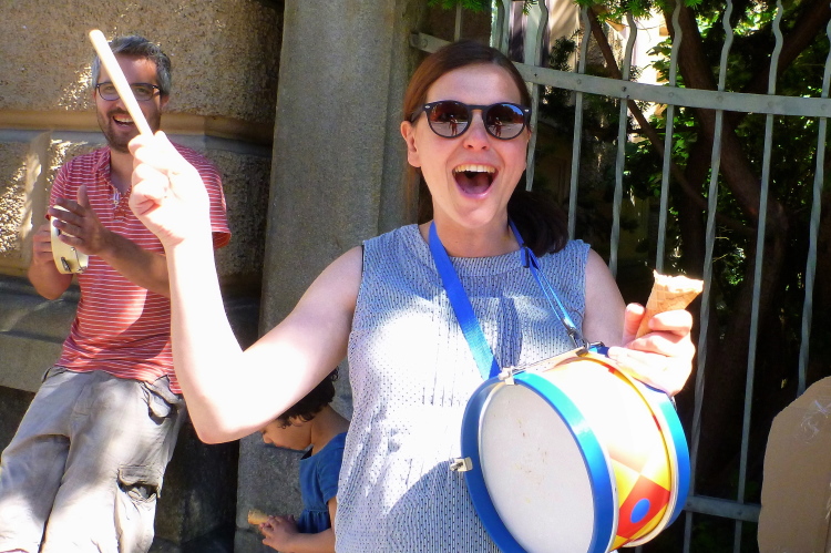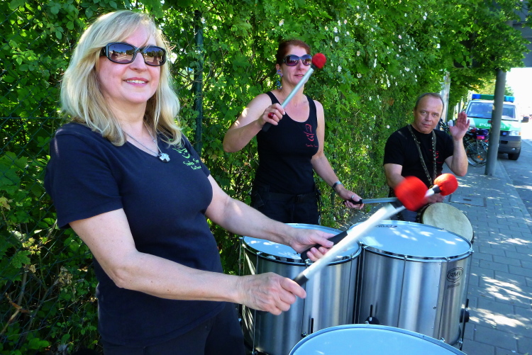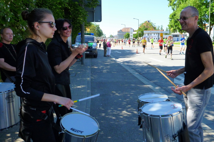 Die Prüfstrecke ist eine Straße mit drei Fahrbahnen, die im Bereich der Wenden nach außen überhöht sind. Natürlich sind Leitplanken an den Kurven. Mir macht dieser Kurs saumäßig Spaß, du kannst da Kurven schneiden, vielleicht ein paar Meter schnippeln und der Fotograf geht sogar von der Piste, weil er die Läufer aus dem Gras besser fotografieren kann. Die Sambaband Sarara hat sich strategisch gut aufgestellt: Direkt an der Einfahrt, von dort hören wir die Rhythmen auf den nächsten 1,3 Kilometern, denn solange ist der Prüfkurs.