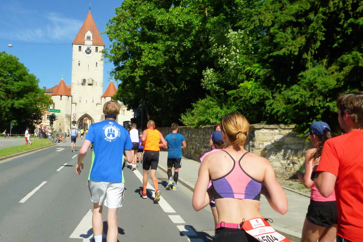 Ostentor. Dort mündet die Strecke des Viertelmarathons auf unsere Strecke. Sofort kommt wieder Schwung in meinen Lauf. Ein leicht übergewichtiger Läufer spricht: „Mit dem Marathoni laufe ich jetzt mit.“ Auf meinen Wunsch, mir als Pacemaker zu dienen, lässt er gleich abreißen und fällt zurück. Vor dem Alten Rathaus ist jetzt der Bierstand besetzt, ich lasse mir eins einschenken. Nährstoff!
